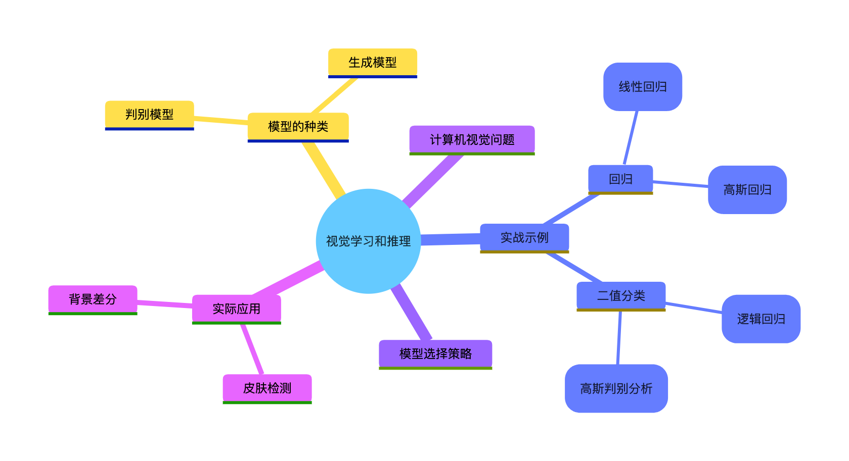 4.实际应用:皮肤检测(二值分类)、背景差分(生成模型 GMM)是视觉学习的典型落地场景。