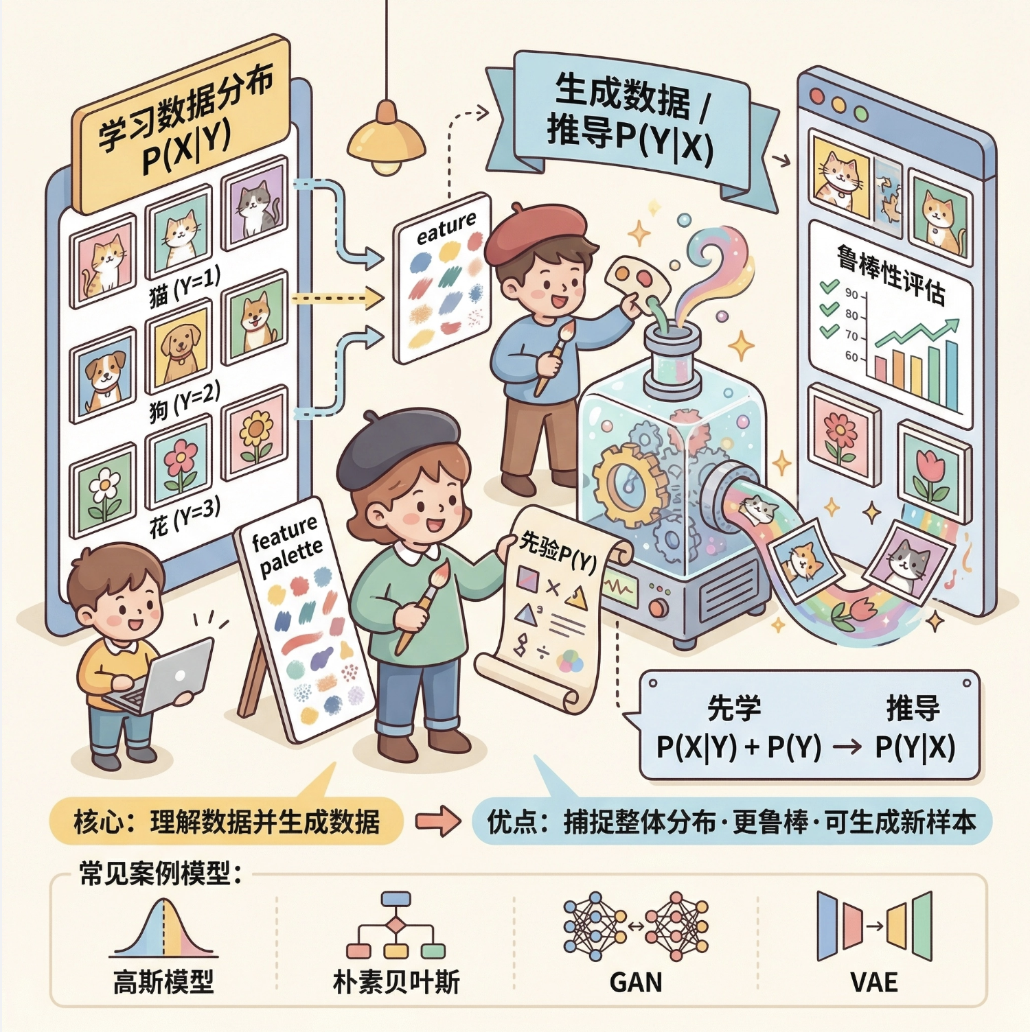 核心逻辑 :先学习输入数据本身的分布 P(X∣Y)(给定标签 Y 时 X 的分布),再结合先验概率 P(Y) 推导 P(Y∣X),目标是 "理解数据并生成数据"。