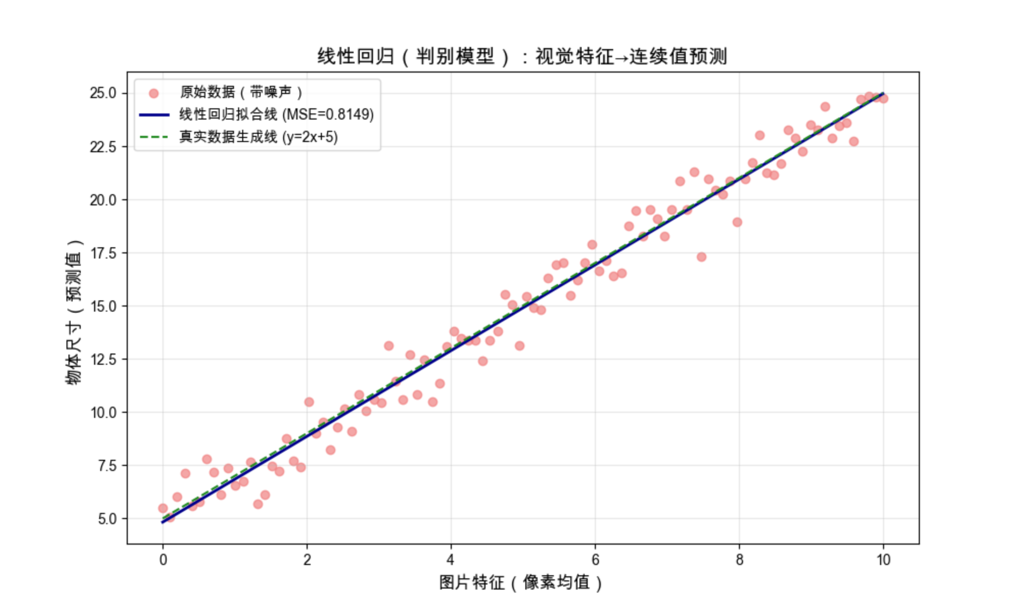 - 红色散点:模拟的带噪声视觉数据(比如 "像素均值" 和 "物体尺寸" 的对应关系)