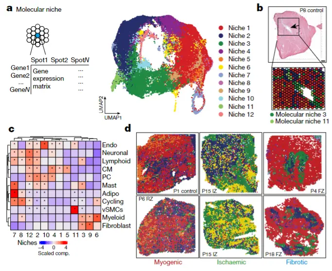 直接揭示多细胞组成的结构或单元。例如,识别出"三级淋巴结构"区域(富含B细胞、T细胞、滤泡树突状细胞的空间共定位)、"血管周围生态位"(平滑肌细胞、内皮细胞、周细胞的特定组合)或"免疫排斥"区域(肿瘤细胞与免疫细胞彼此分离)。