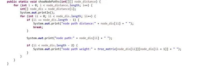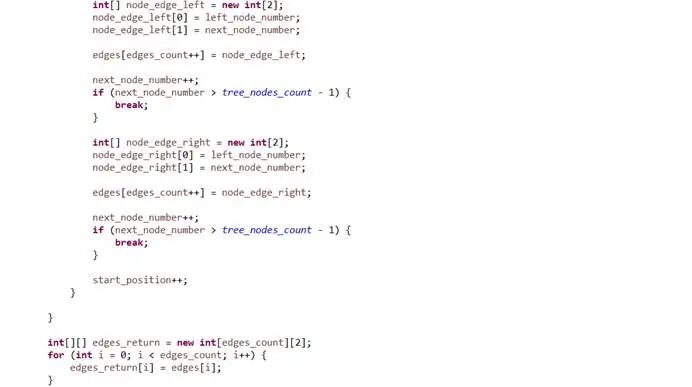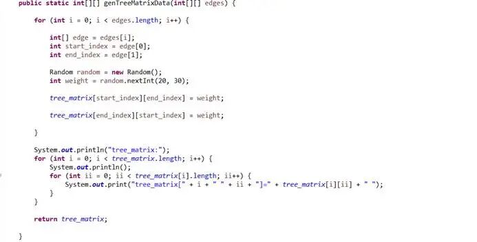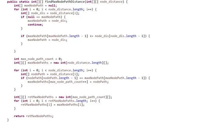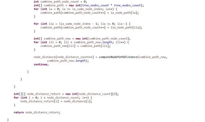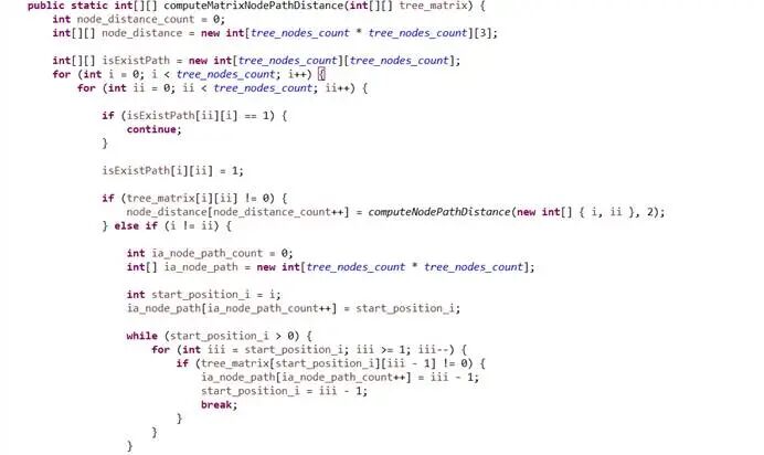 | 使用矩阵的数据结构存储一颗树形结构,矩阵中节点之间有边的元素值为1,无边的元素值为0。 定义二维数组存储树形结构的节点之间的权值,第一维数组的索引值表示树形结构的序号,第二维数组索引值表示树形结构的序号,第二维数组的元素值表示节点之间的权值,n个节点的树形结构,矩阵大小为n*n,二维数组大小为n*n。 遍历树形结构对应的矩阵关系的二维数组,计算所有节点路径的距离,得出节点路径距离的最大值。 遍历树形结构对应的矩阵关系的二维数组,计算所有节点路径的距离,得出节点路径距离大于k的节点路径总数。 |