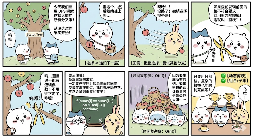 javaif (path.size() > 0 && path.get(path.size()-1) % 2 == 0 && nums[i] % 2 == 0) continue; // 剪枝:避免连续偶数