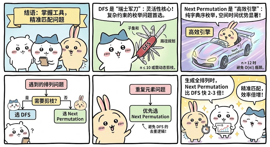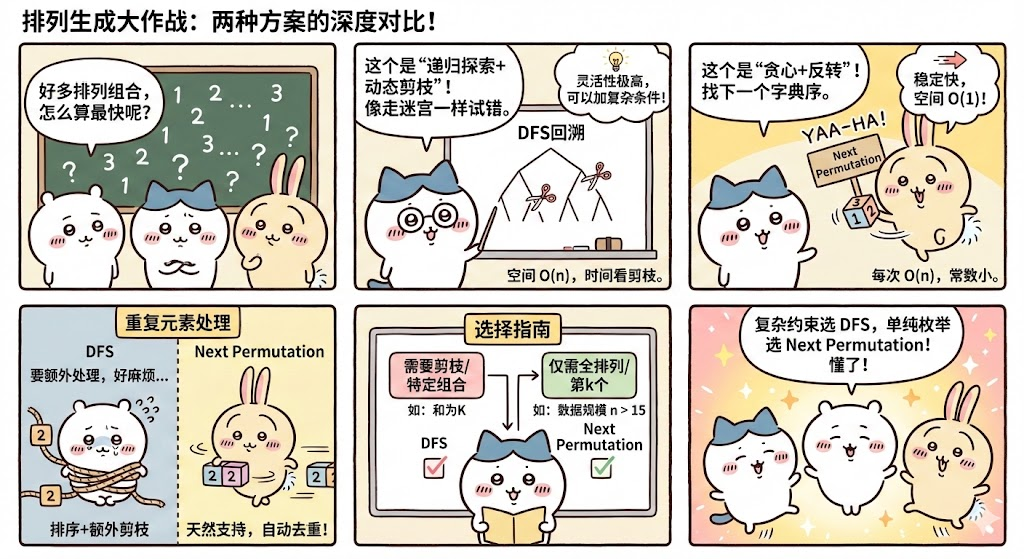 | 有重复元素且需去重 | Next Permutation | 自动处理重复,DFS需额外排序+剪枝 |
