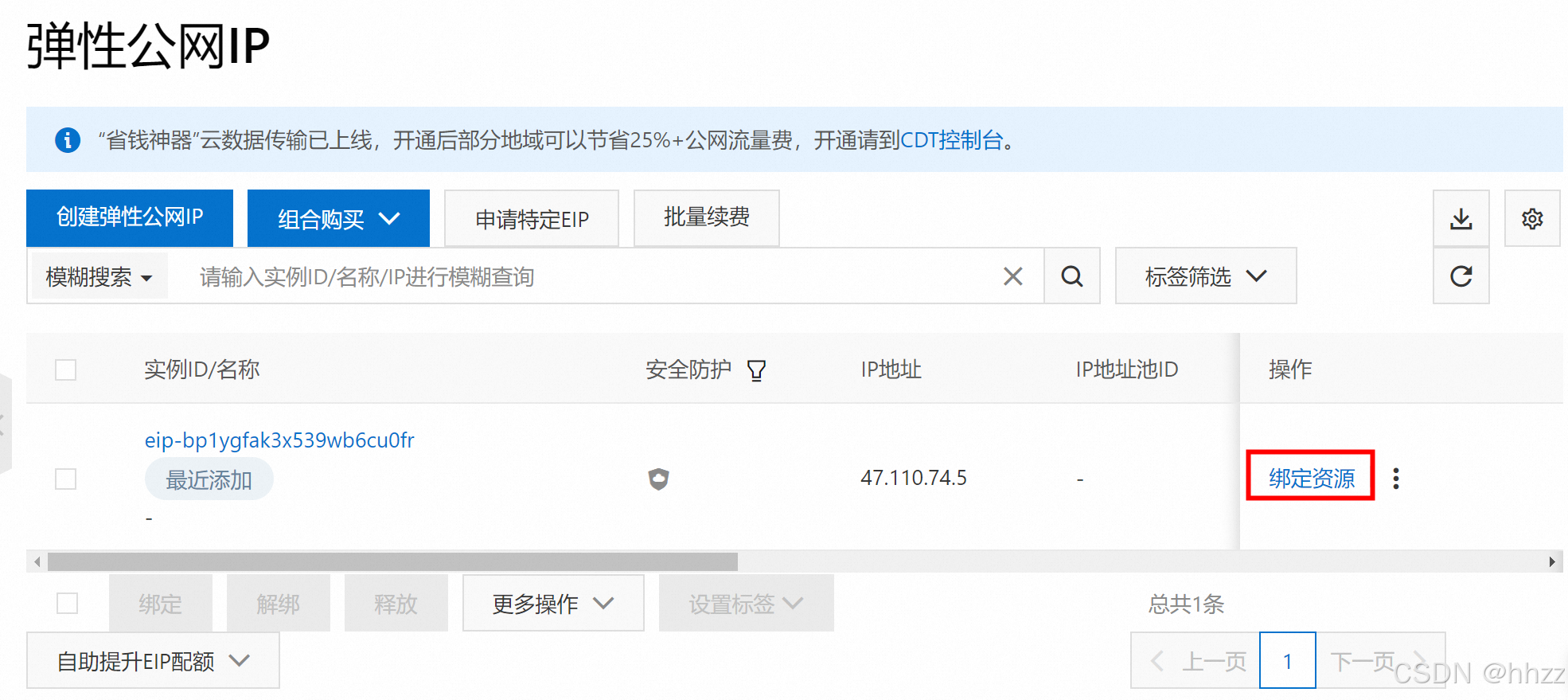 将私网CLB实例绑定到弹性公网IP:再次访问弹性公网IP控制台,点击绑定资源按钮