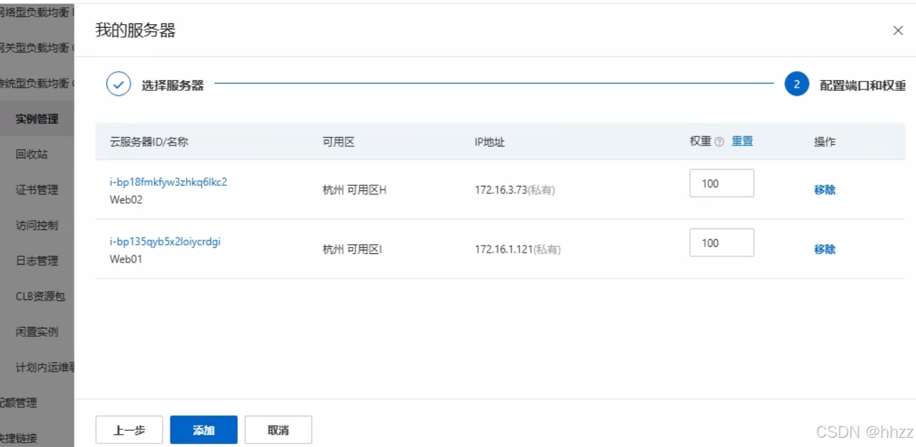 后端服务器:选择默认服务器组,并点击继续添加,全选两台ECS后,点击下一步