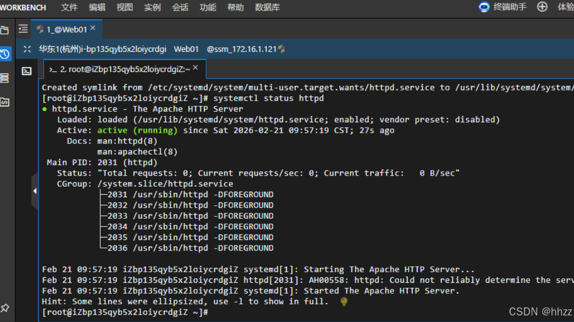 运行Apache服务,分别在两台ECS中,输入以下命令完成Apache服务的启动和开机自动运行设置,最后通过systemctl status httpd进行Apache服务器状态的查看: