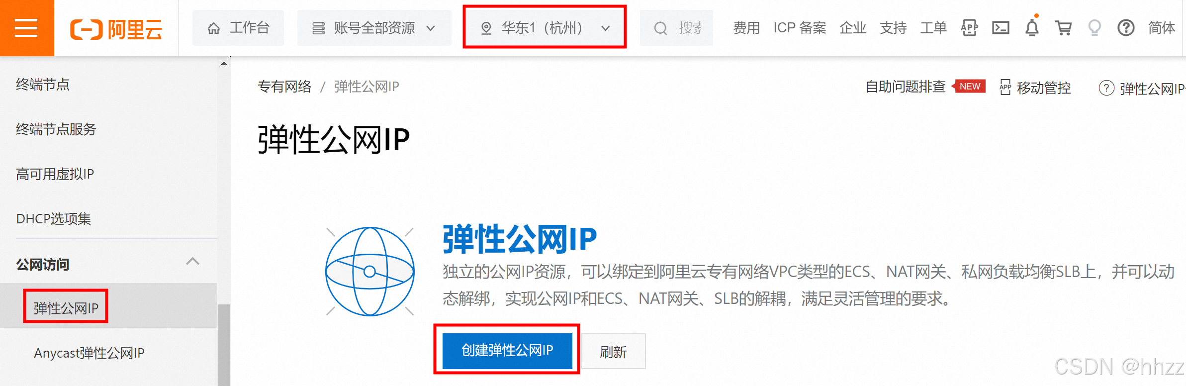 https://vpc.console.aliyun.com/eip/cn-hangzhou/eips