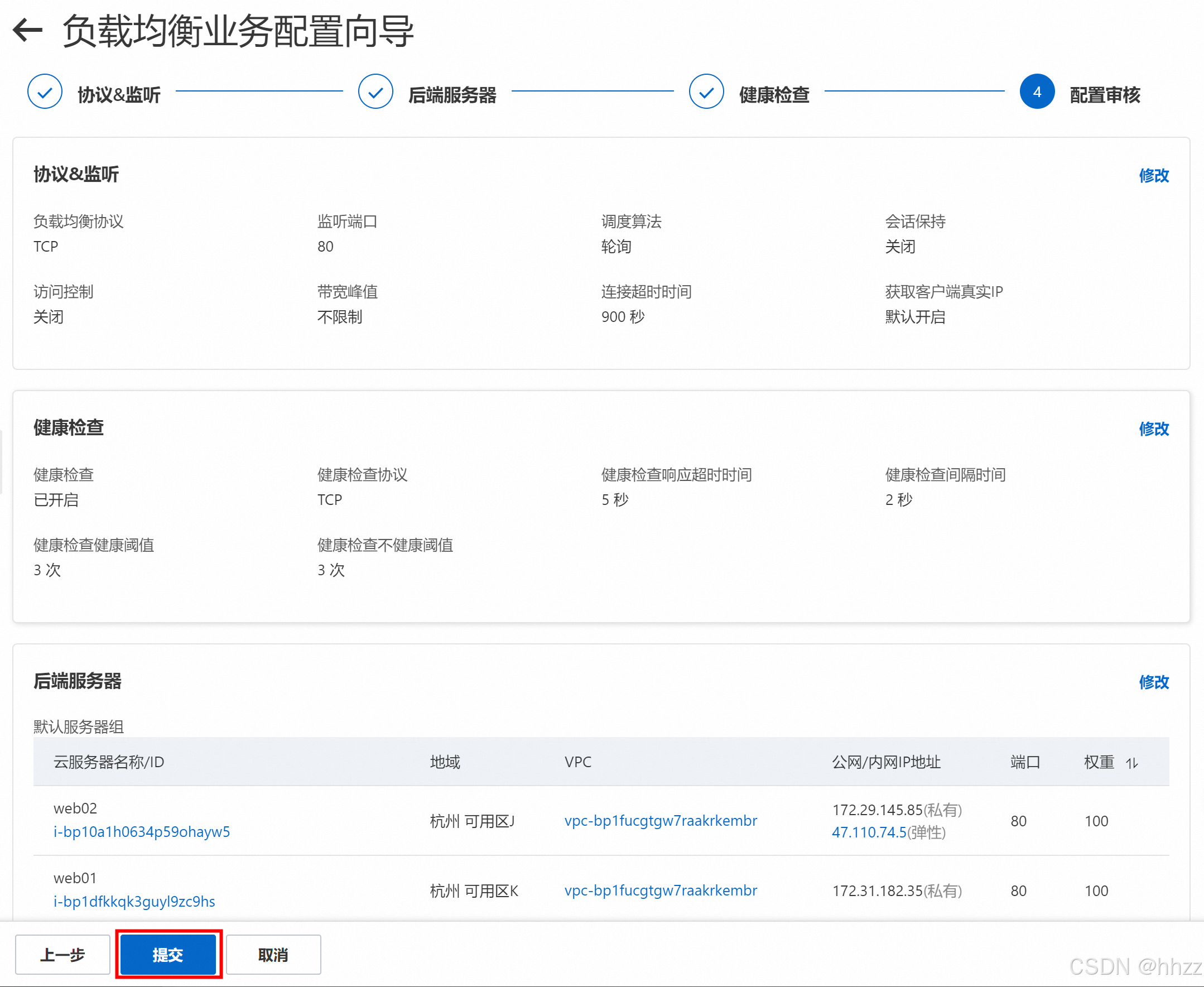 - 配置审核:确认配置无误后,直接点击提交,完成传统负载均衡CLB的配置