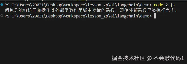 运行后,你会看到模型根据"前端面试官"的身份,用不超过50字解释了闭包。