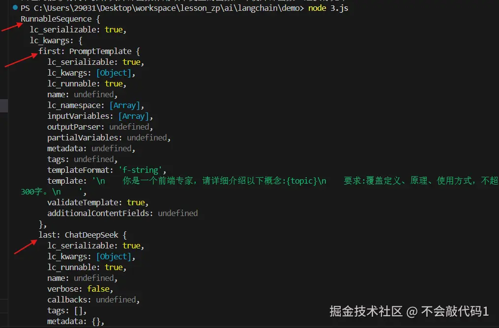 RunnableSequence.from([...])把两个步骤串起来。数组里的每个元素是一个函数,接收上一步的输出,返回下一步的输入。 - 最后调用