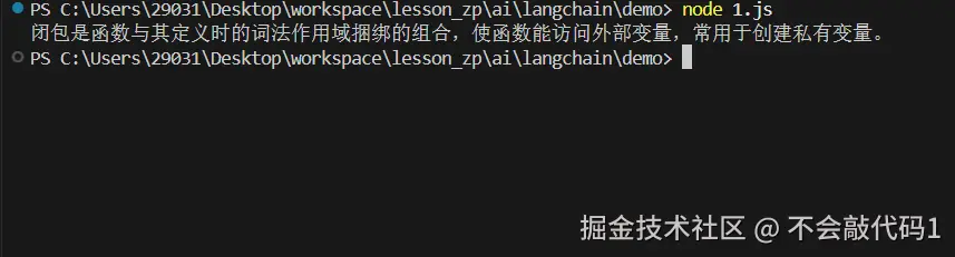 运行后你会看到模型先给出了关于闭包的详细解释(不超过300字),然后给出了三个要点总结。整个流程自动化完成,无需人工介入。