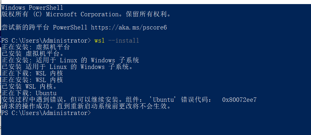 从日志看,WSL 核心组件已经安装成功,只是 Ubuntu 下载失败。先重启电脑,让系统完成必要的更新,再继续操作。