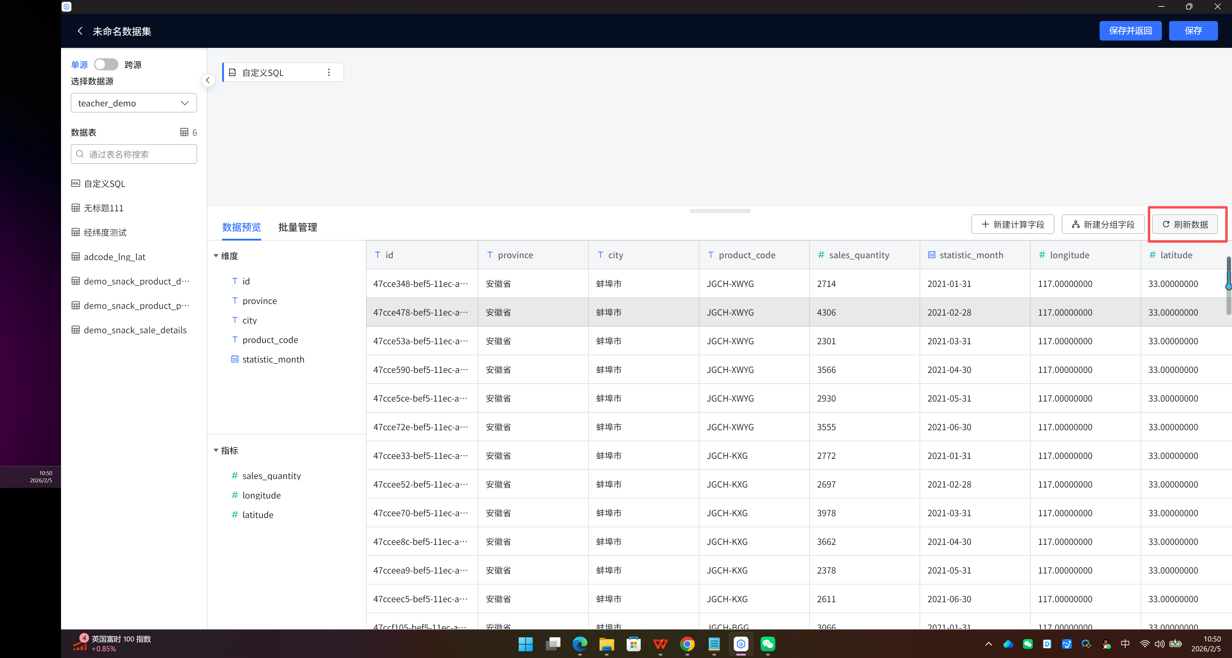 - 点击画布上方的 【刷新数据】 按钮,系统会再次执行SQL,并在页面下方显示整个数据集的最新预览结果。这是最终用于制作图表的数据。