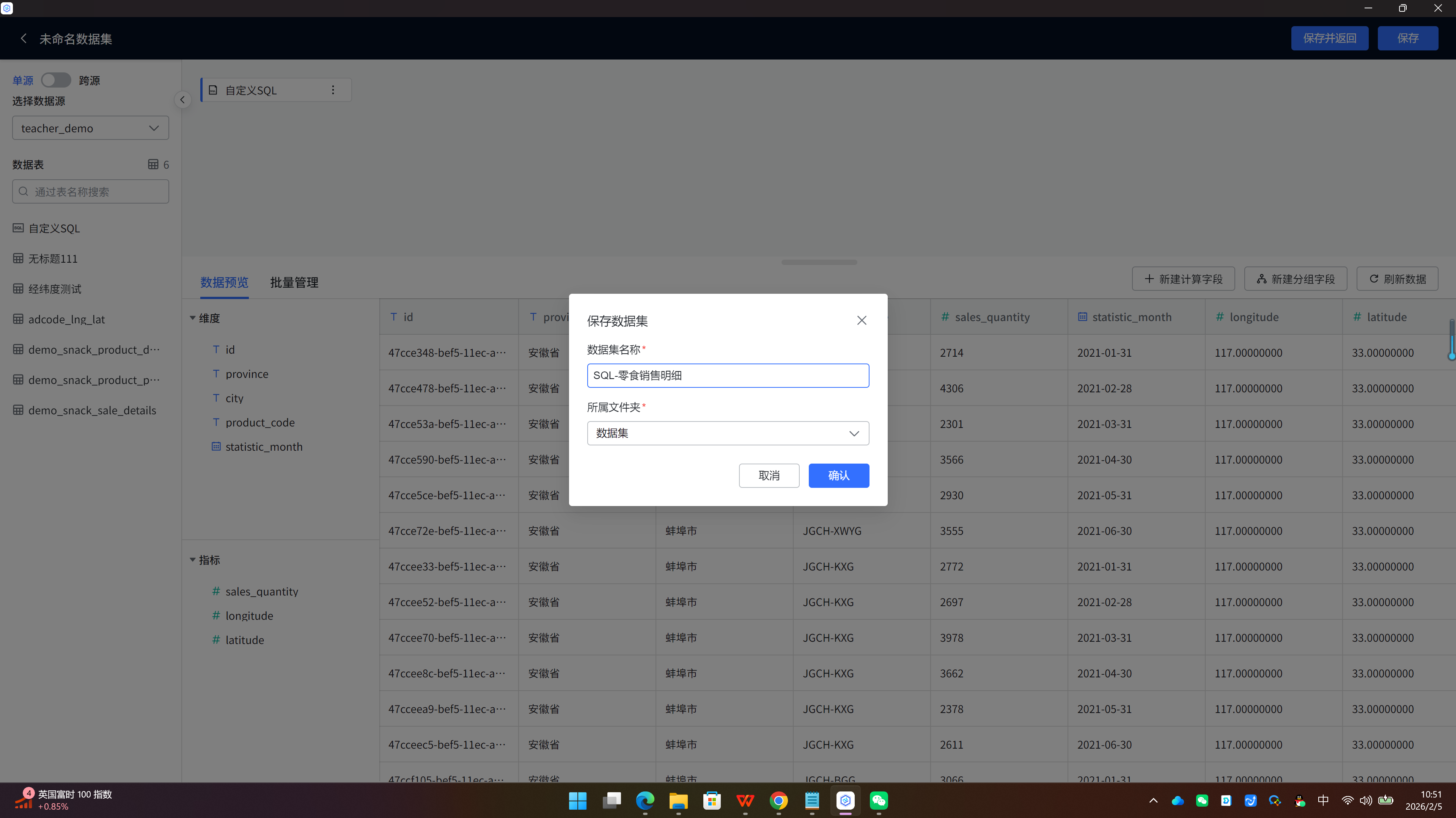 - 此时会弹出最终的"保存数据集"对话框(见图7-10)。请注意,此处需要为整个数据集命名(可以与SQL组件名相同或不同)。输入数据集名称(例如 "SQL-零食销售明细" ),选择存放的文件夹,然后点击 【确认】 保存。
