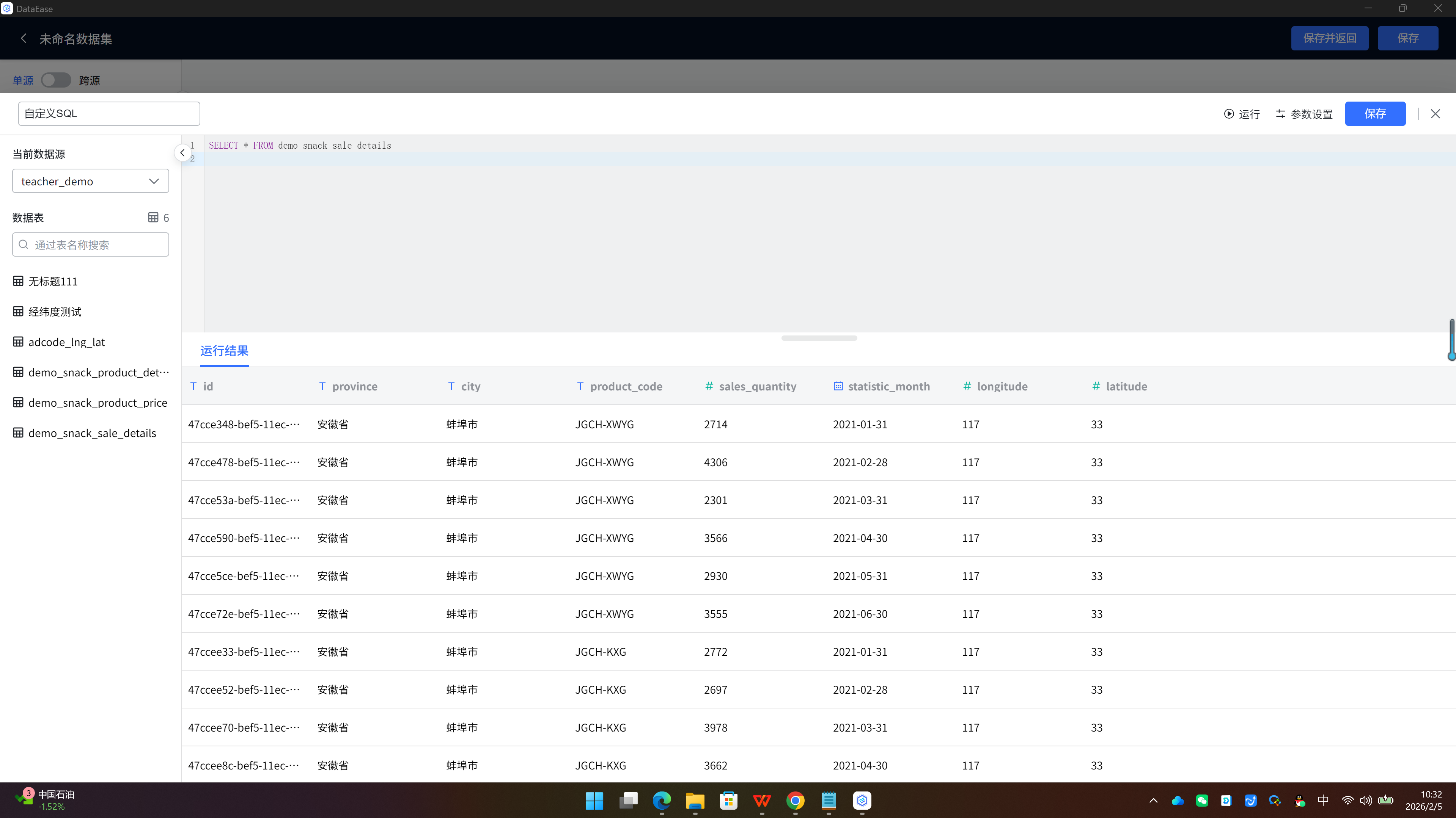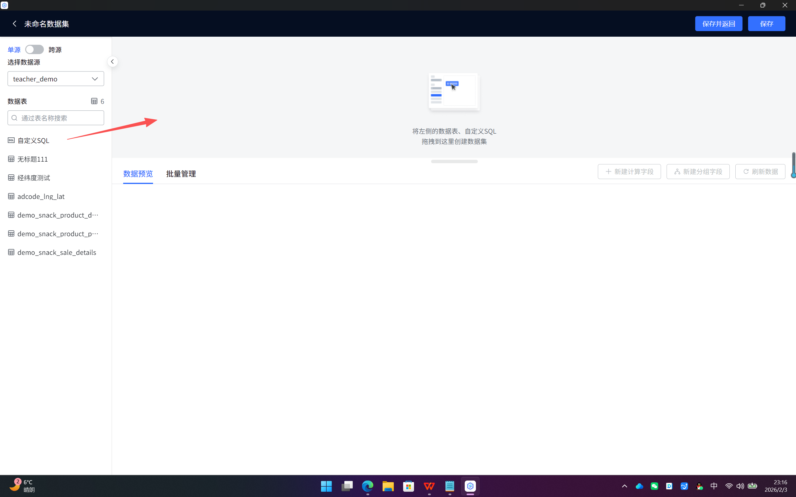 本节将基于前面创建的MySQL数据源------"Demo" ,演示如何通过编写SQL语句,创建名为 "SQL-零食销售明细" 的自定义SQL数据集。