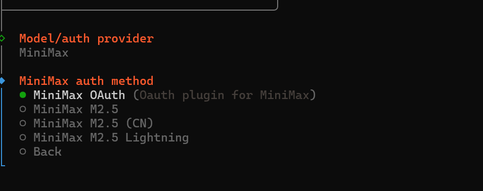 6、此处个人选择的是minimax,因为注册之后会送TOKEN,可以先用来体验一下,当然,有实力的更推荐Anthropic。接下来按住回车,进入下一项选择,如下图: