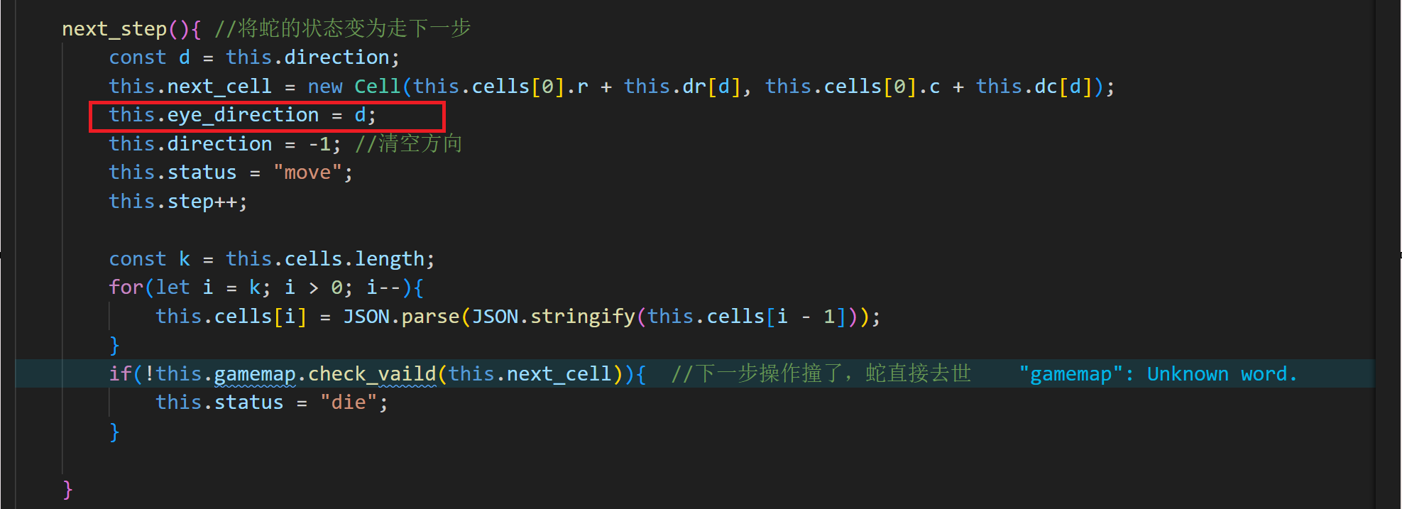 let k = snake.cells.length; 获取当前蛇的身体单元格数量。