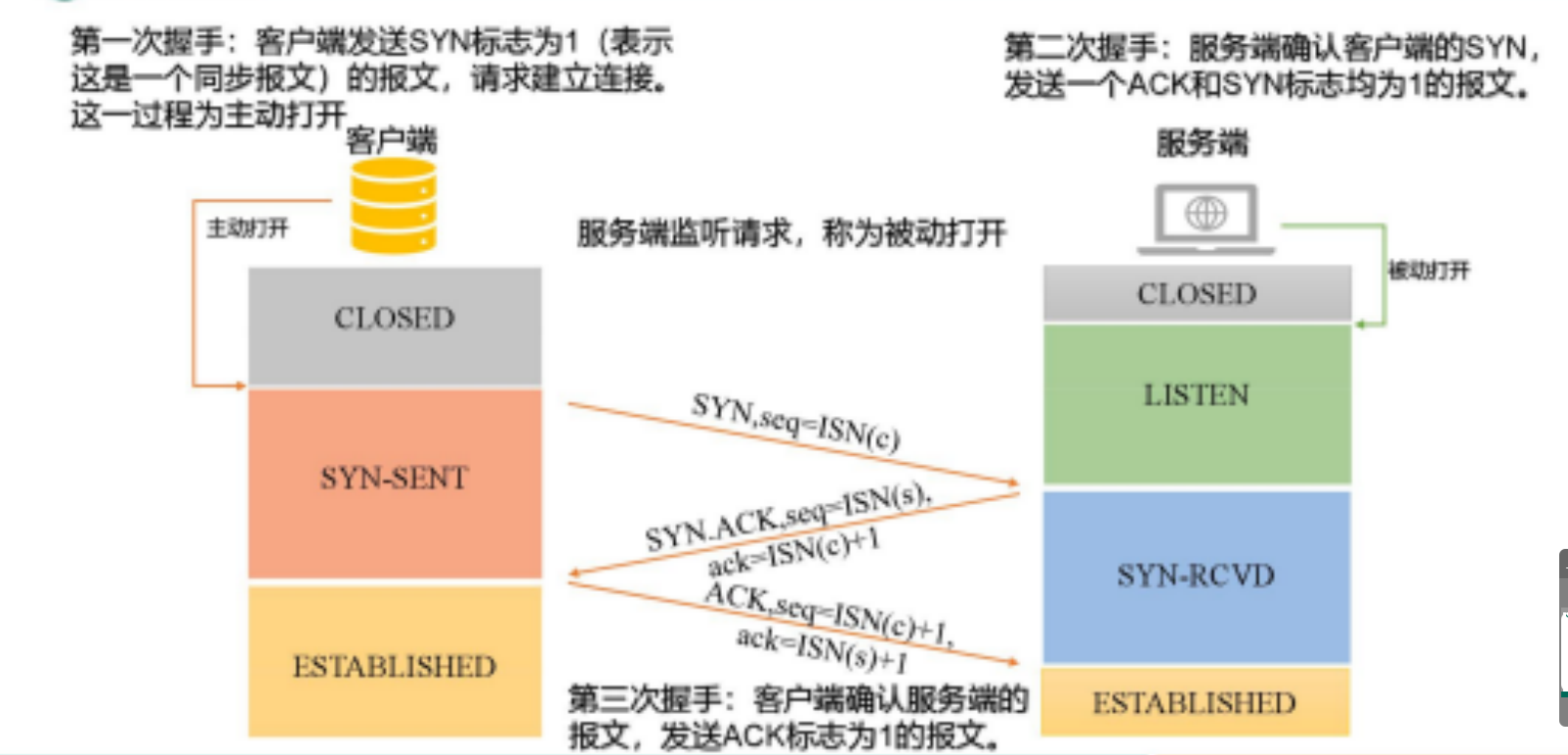 - 在服务器端监听来自客户端的连接请求。服务器在这个状态下等待进入的 SYN 报文