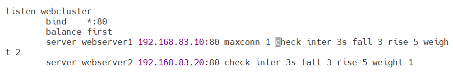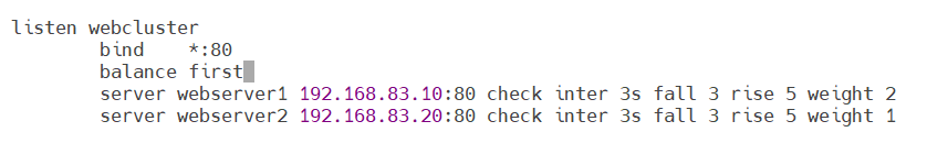 设定算法种类(balance static-rr)以及权重大小(webserver1:weight 2;webserver2:weight 1)