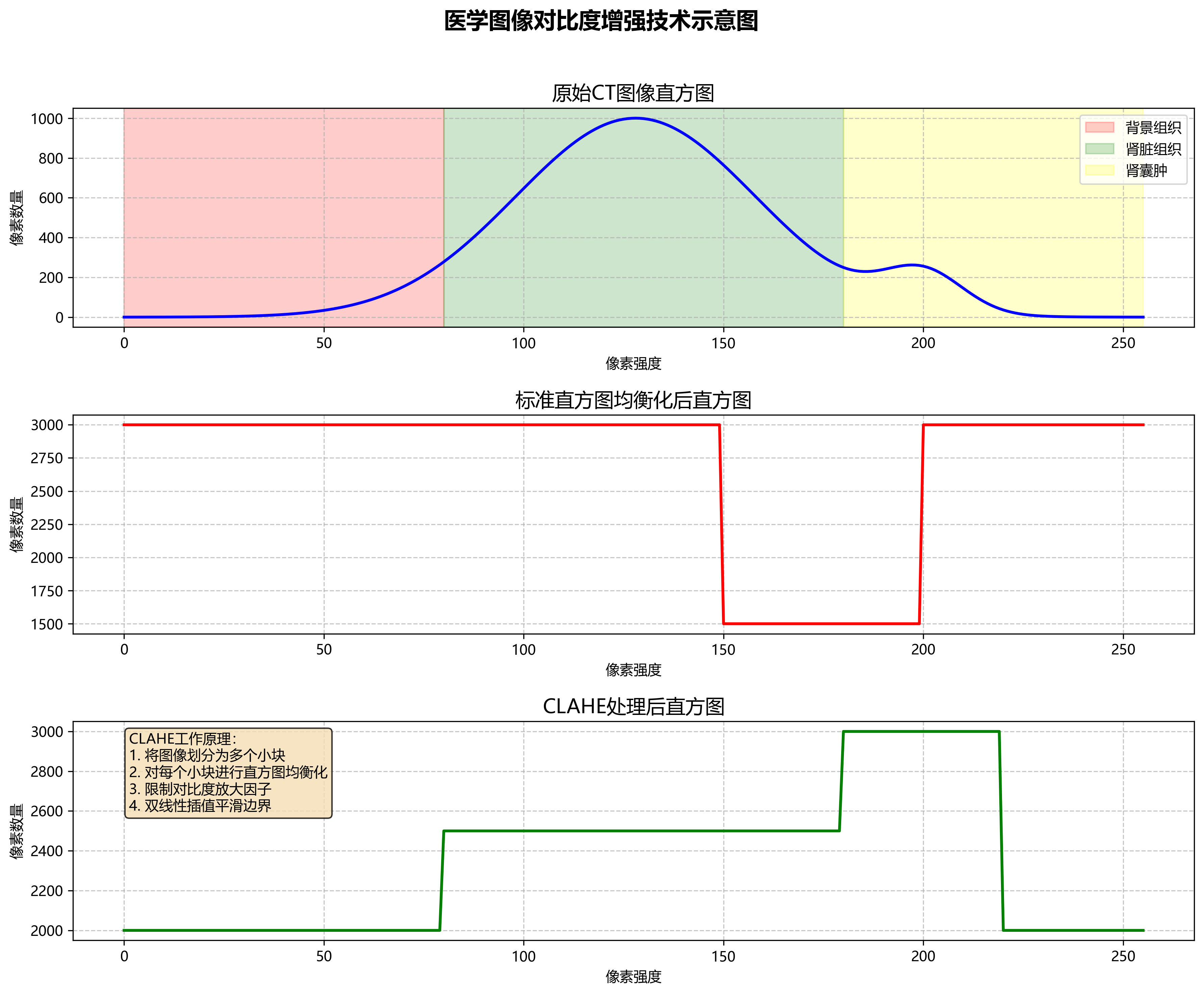 对比度增强是改善医学图像视觉质量的关键技术。直方图均衡化是一种常用的对比度增强方法,通过重新分布图像像素强度来增强对比度。对于医学图像,自适应直方图均衡化(如CLAHE)能够在增强对比度的同时抑制噪声放大。CLAHE将图像分为多个小块,对每个小块进行直方图均衡化,通过限制对比度放大因子来控制噪声增强。在肾脏CT影像中,适当的对比度增强可以突出肾脏与周围组织的差异,使肾囊肿等低密度病变更加明显。