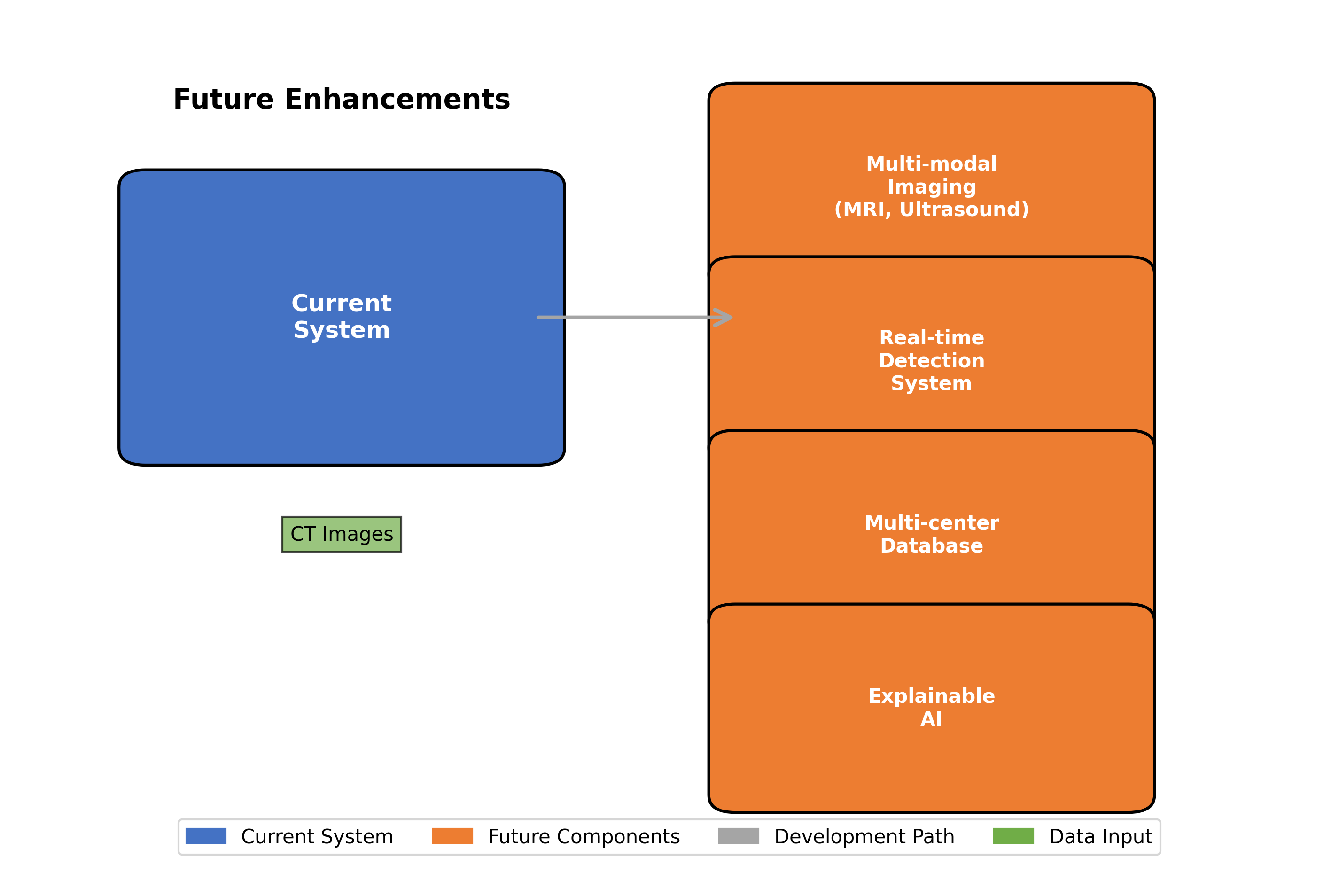 未来,我们计划从以下几个方面改进现有系统:1) 引入更多模态的医学影像,如MRI和超声,提高诊断准确性;2) 开发实时检测系统,实现CT影像采集后的即时分析;3) 构建大规模多中心数据库,增强模型的泛化能力;4) 探索可解释AI技术,提高模型的透明度和可信度。🚀