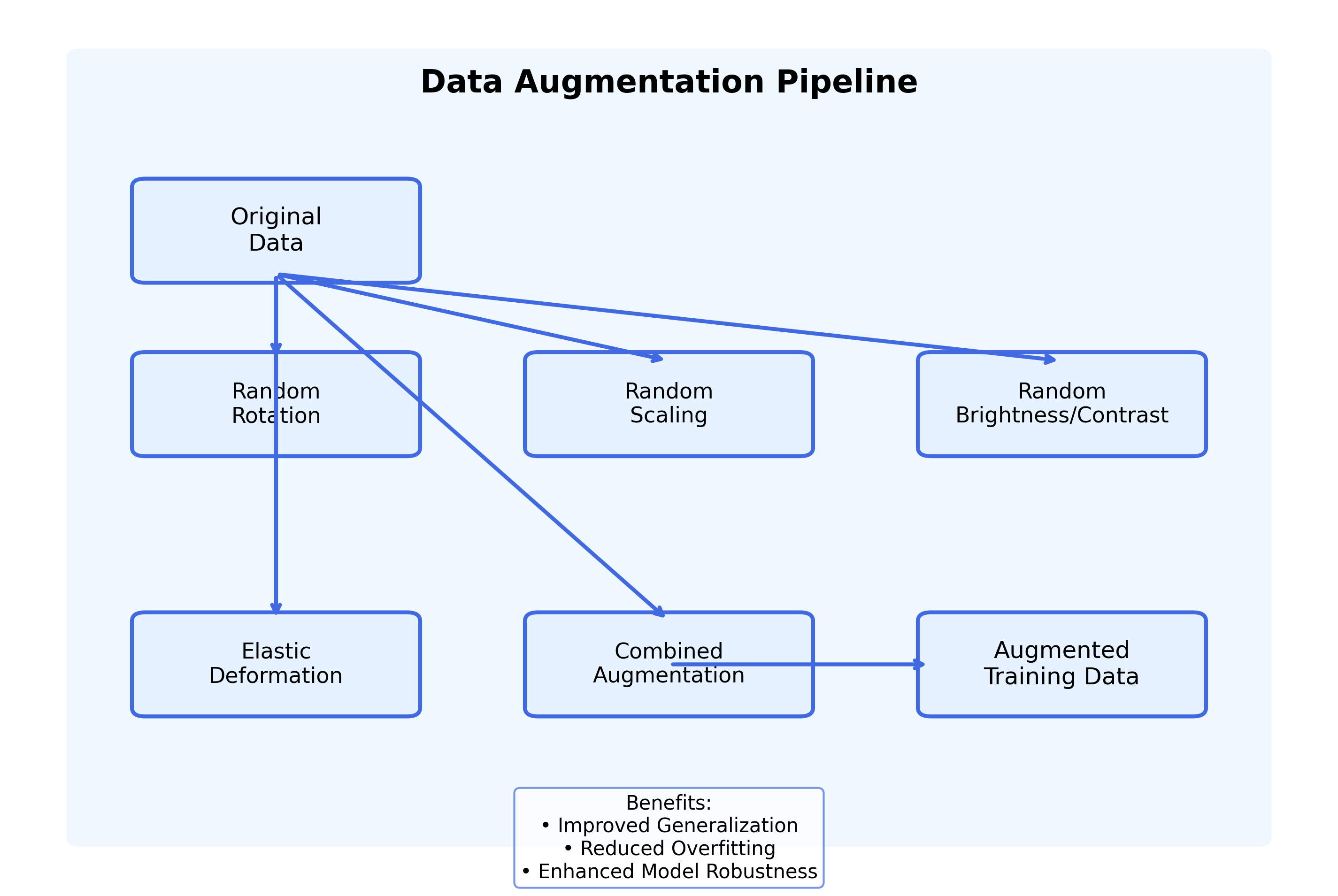 为了提高模型的泛化能力,我们采用了多种数据增强技术,包括随机旋转、随机缩放、随机亮度和对比度调整、弹性变形等。这些技术能够在不改变标签的前提下,生成多样化的训练样本,减少过拟合风险。🎨