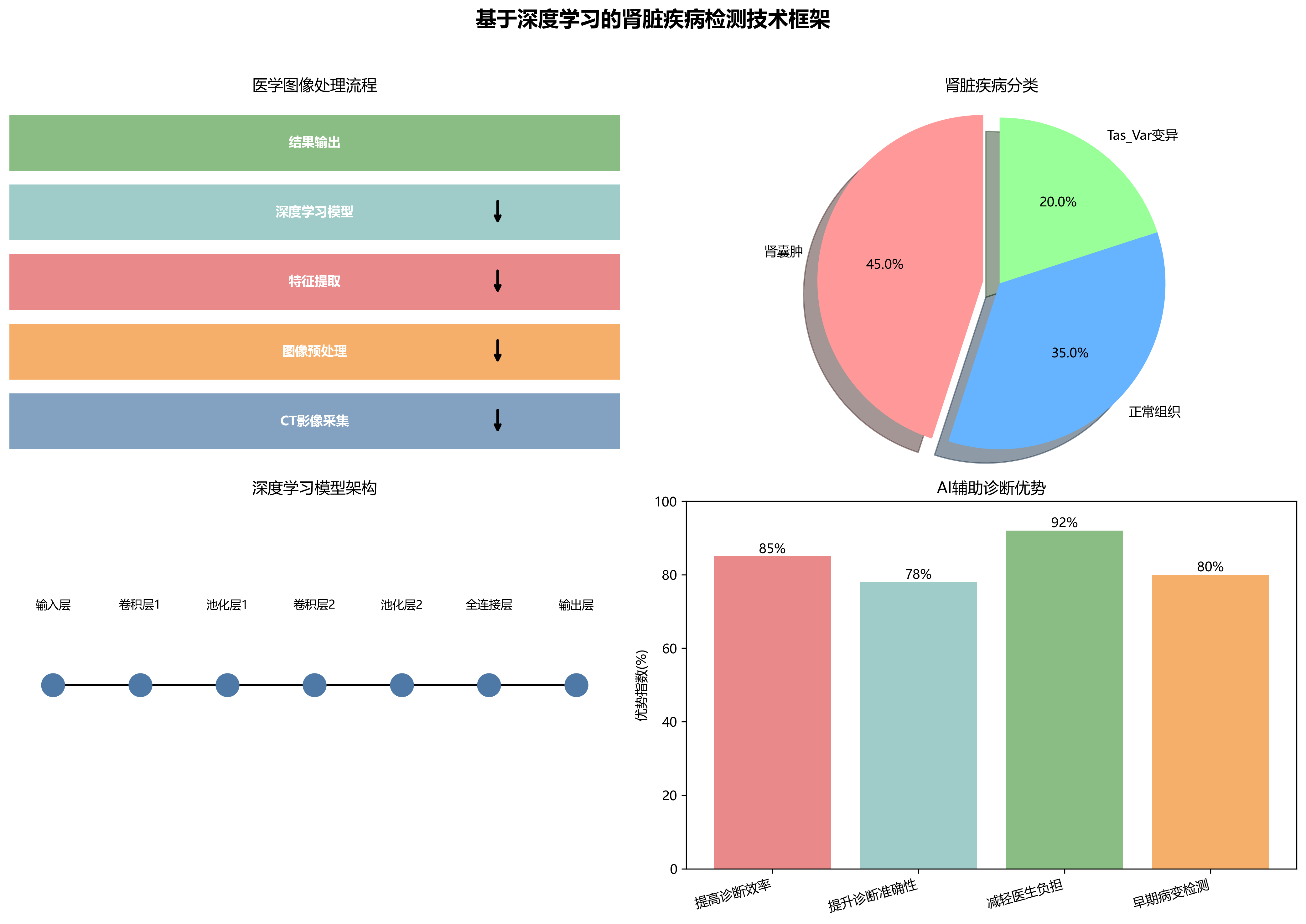 本研究采用基于深度学习的肾脏疾病检测与分类模型,主要由三个模块组成:特征提取模块、病变检测模块和病变分类模块。特征提取模块采用改进的3D ResNet结构,能够有效捕捉肾脏CT影像的三维空间特征;病变检测模块基于U-Net架构,通过引入注意力机制提高对病变区域的敏感性;病变分类模块则采用多任务学习结构,同时输出病变类型和置信度分数。