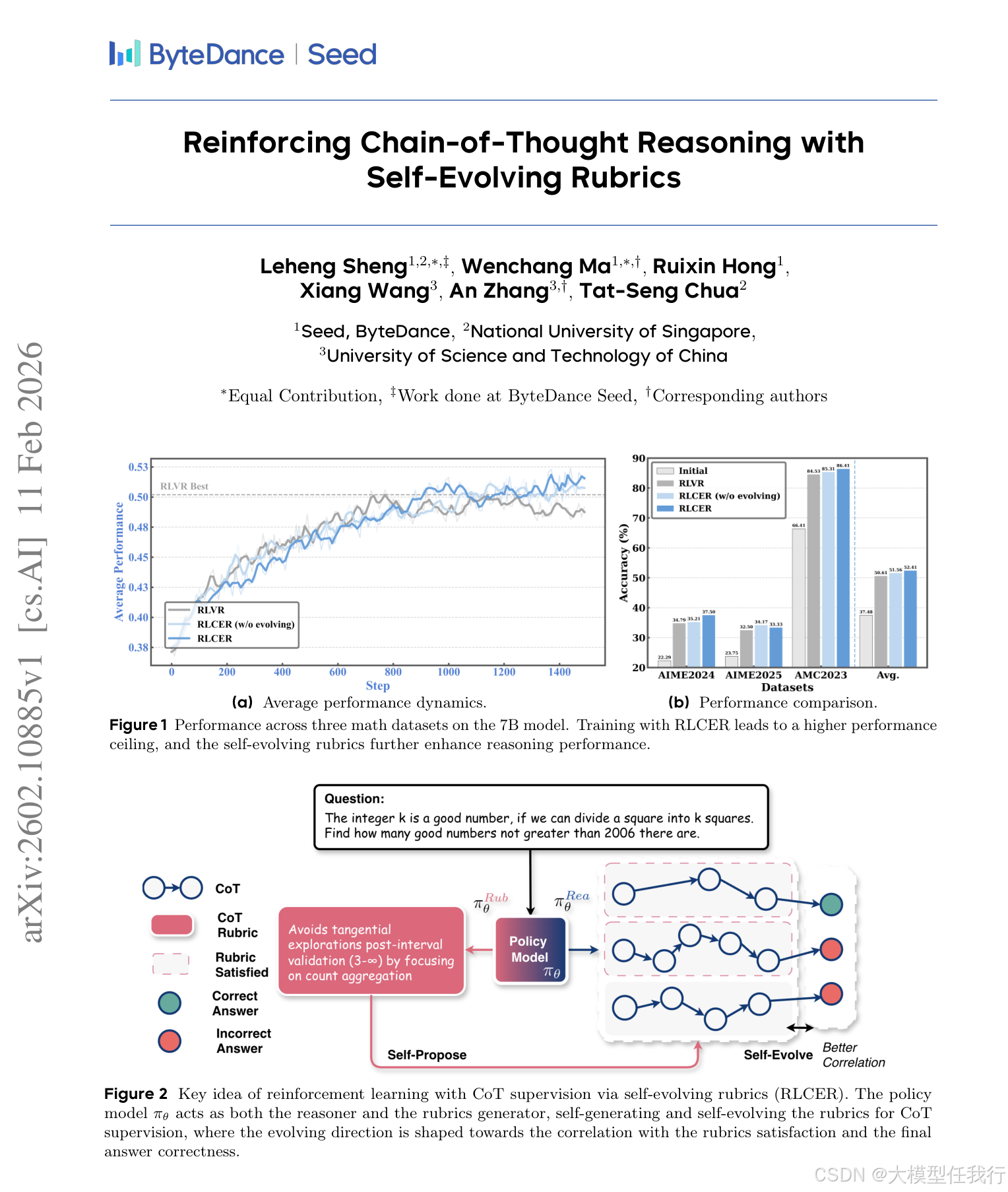 尽管思维链(CoT)在LLM推理中起着至关重要的作用,但直接奖励它是困难的:训练奖励模型需要大量的人类标记工作,而静态RM则与不断演变的CoT分布和奖励黑客作斗争。这些挑战促使我们寻求一种不需要人类注释工作并且可以逐渐演变的自主CoT奖励方法。受最近自我进化训练方法的启发,我们提出了RLCER(Reinforce Learning with CoT监督via Self-Evolving Rubrics),它通过用自我提出和自我进化的rubrics奖励CoT来增强以结果为中心的RLVR。我们表明,即使没有结果奖励,自我提出和自我进化的rubrics也能提供可靠的CoT监督信号,使RLCER能够超越以结果为中心的RLVR。此外,当用作提示提示时,这些自行提出的规则进一步提高了推理时间性能。项目页面:https://alphalab-ustc.github.io/rlcer-alphalab/
