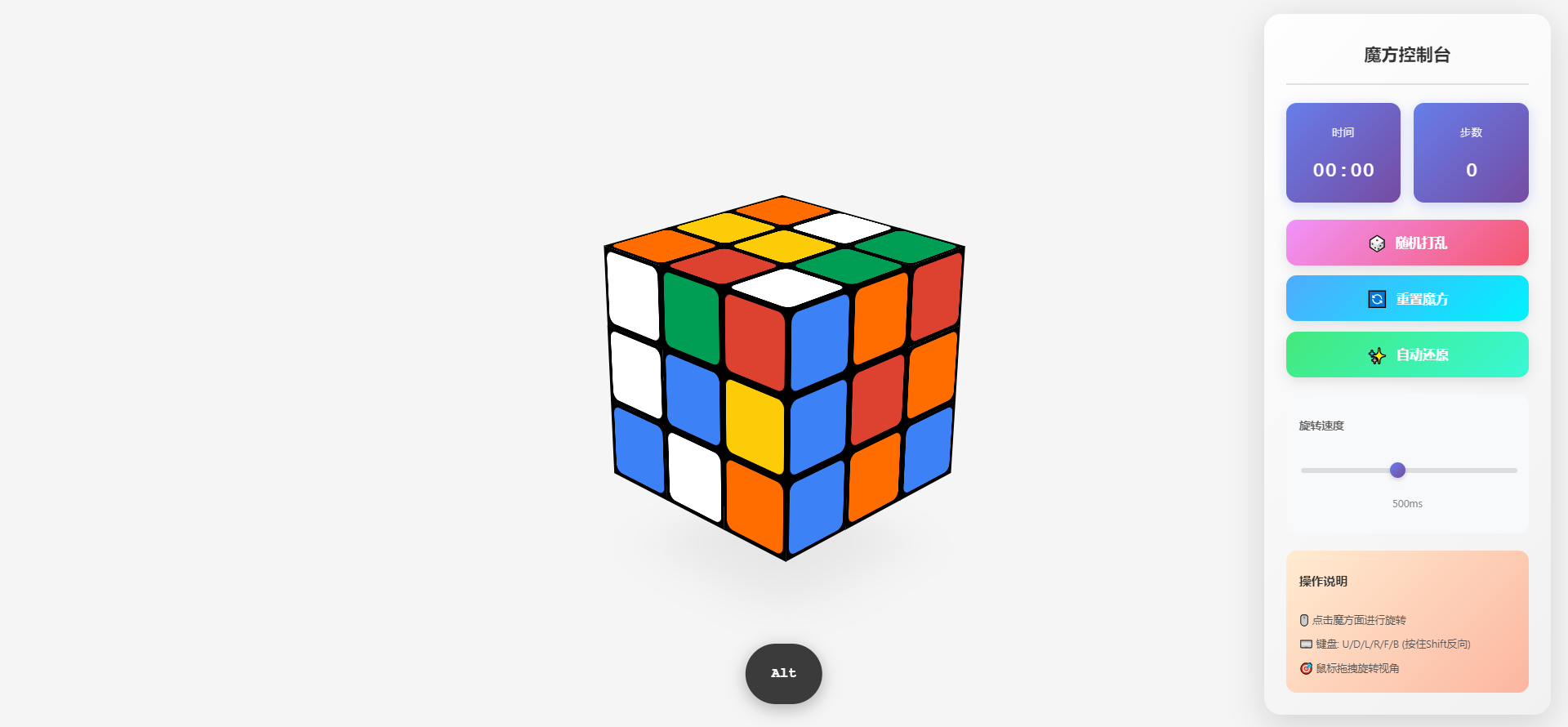 欢迎使用 3D 魔方游戏!这是一个功能完整、操作简便的网页魔方模拟器。