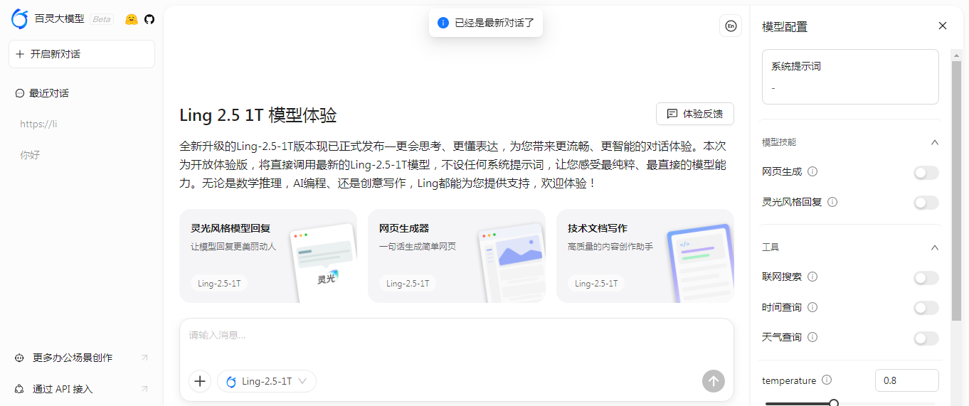 - Ling-2.5-1T 模型:直接调用万亿参数模型(总参数 1T,激活参数 63B),不设系统提示词限制,感受最纯粹的模型能力
