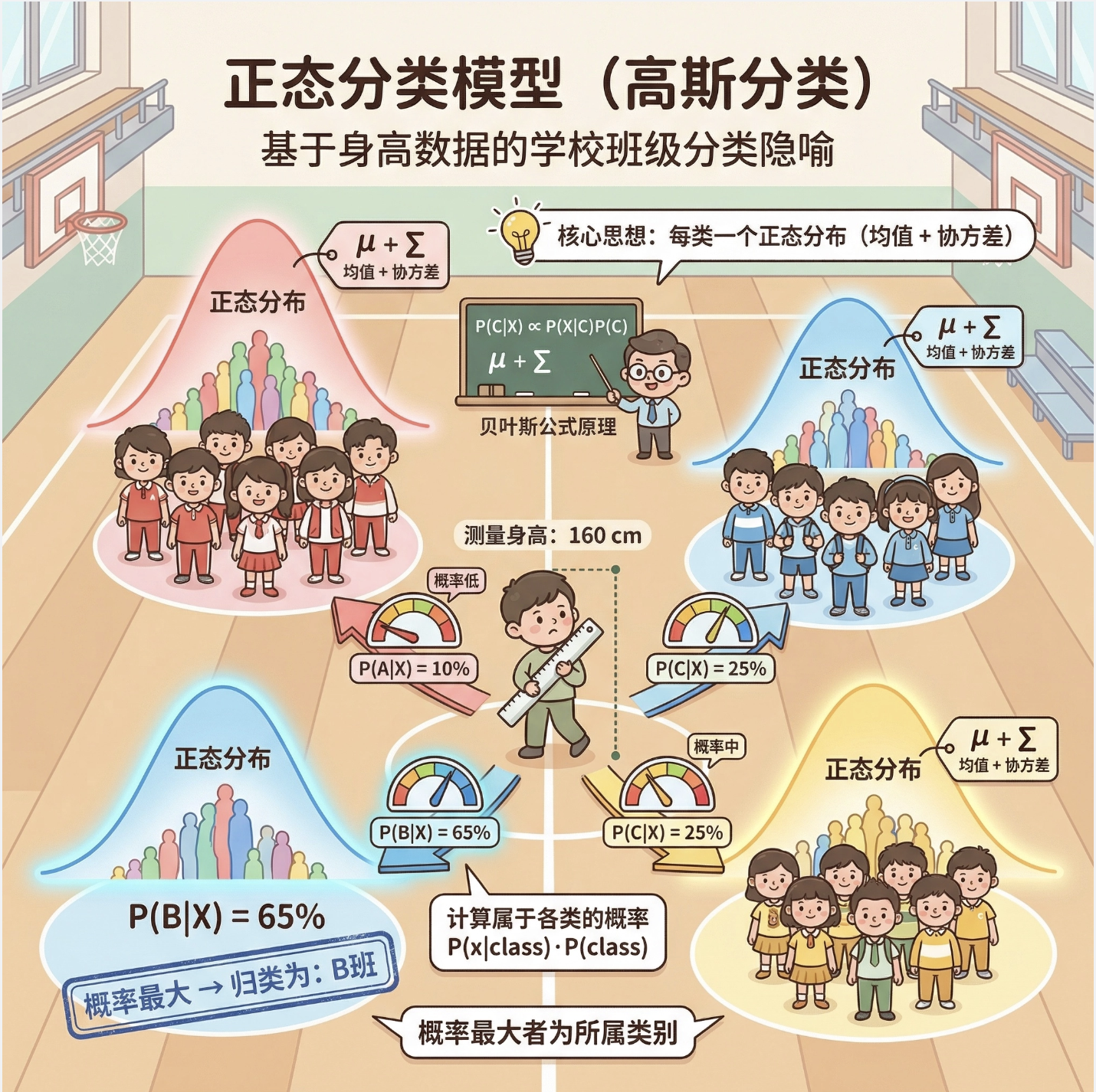 正态分类模型(也叫高斯分类模型)是最简单的密度建模方式 ------ 假设每个类别的数据都服从单峰正态分布 ,就像每个班级的学生身高,都围绕着各自的平均值上下波动。