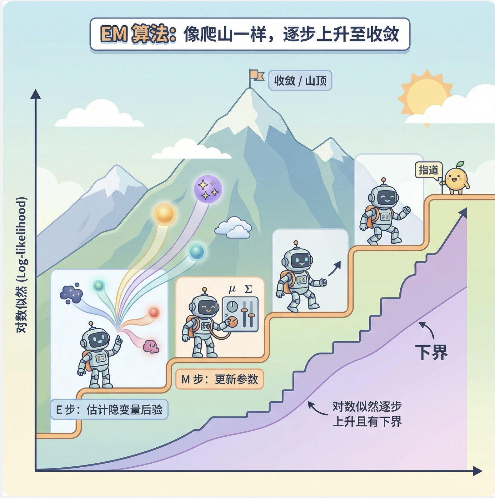 EM 算法每次迭代都能让模型的 "对数似然" 上升,且有一个下界(不会无限上升),就像爬山,每次都往高处走,直到山顶(收敛)。