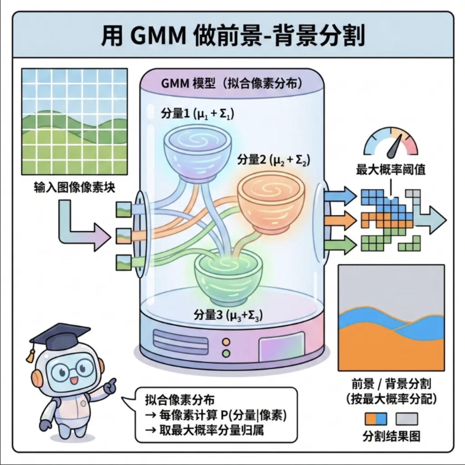 用 GMM 拟合图像的像素分布(比如前景和背景),每个像素分配到概率最大的分量,实现前景 / 背景分割。