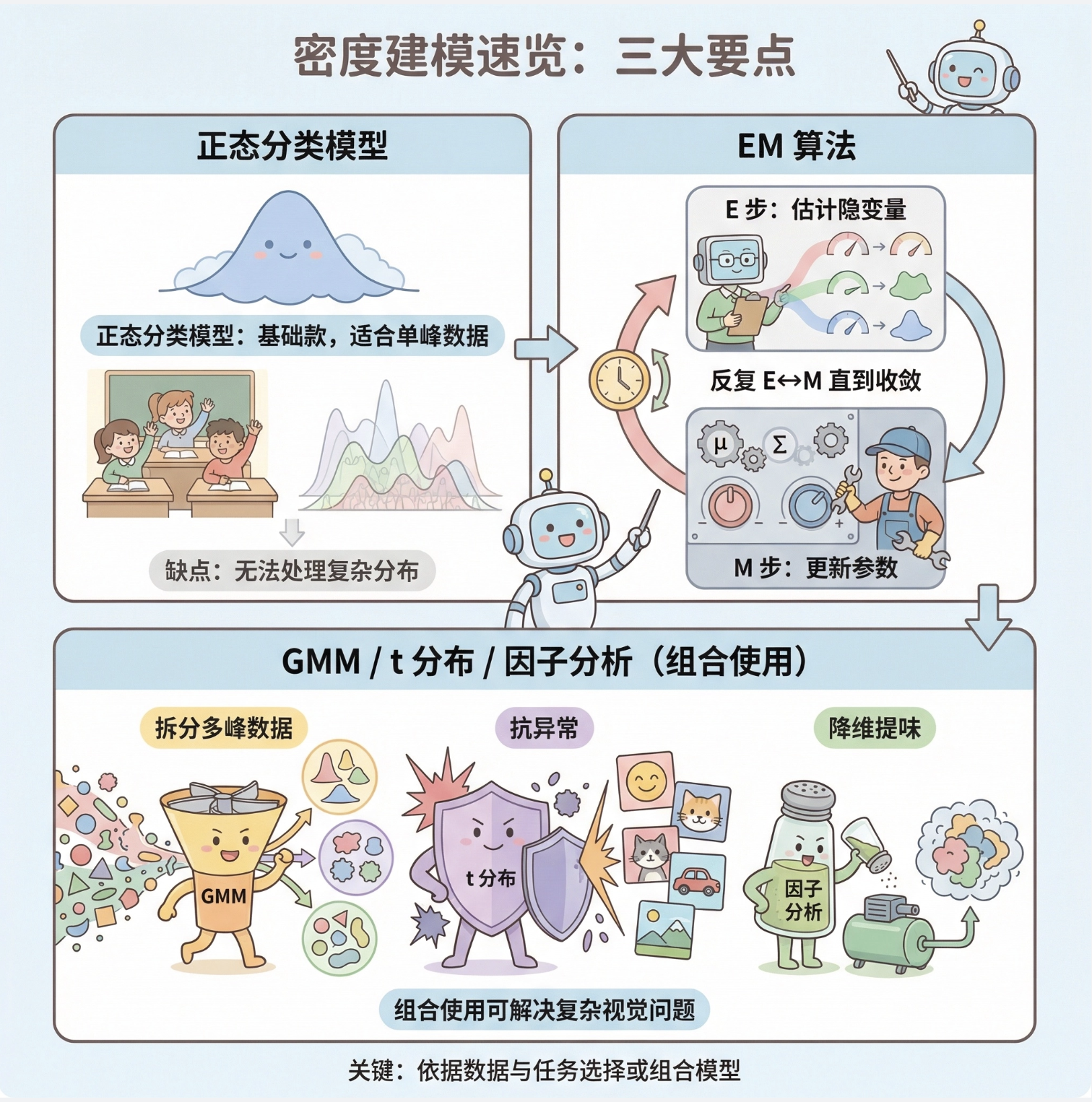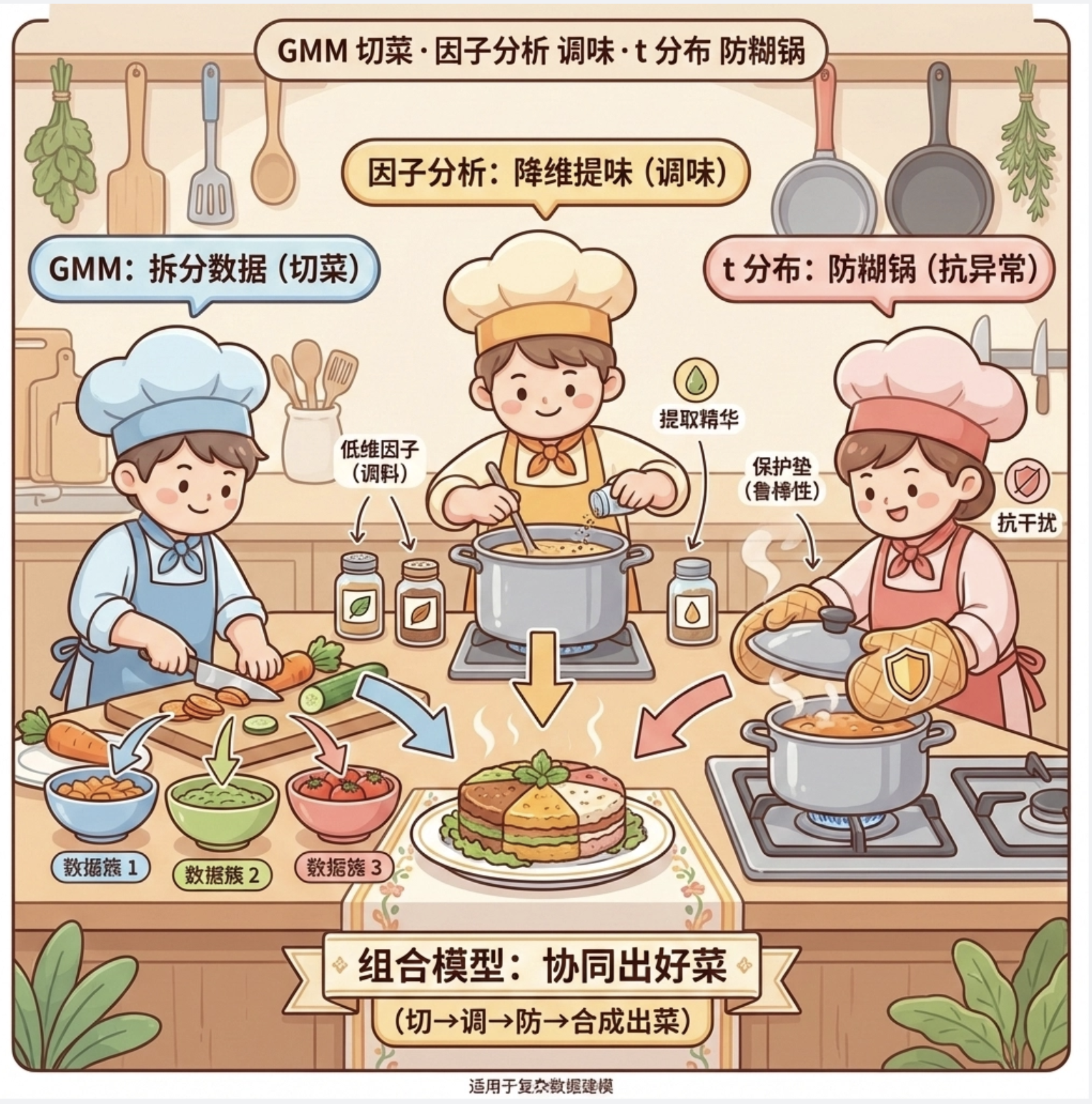组合模型就像做饭:GMM 是切菜(拆分数据),因子分析是调味(降维提味),t 分布是防糊锅(抗异常),合起来做出一桌好菜。