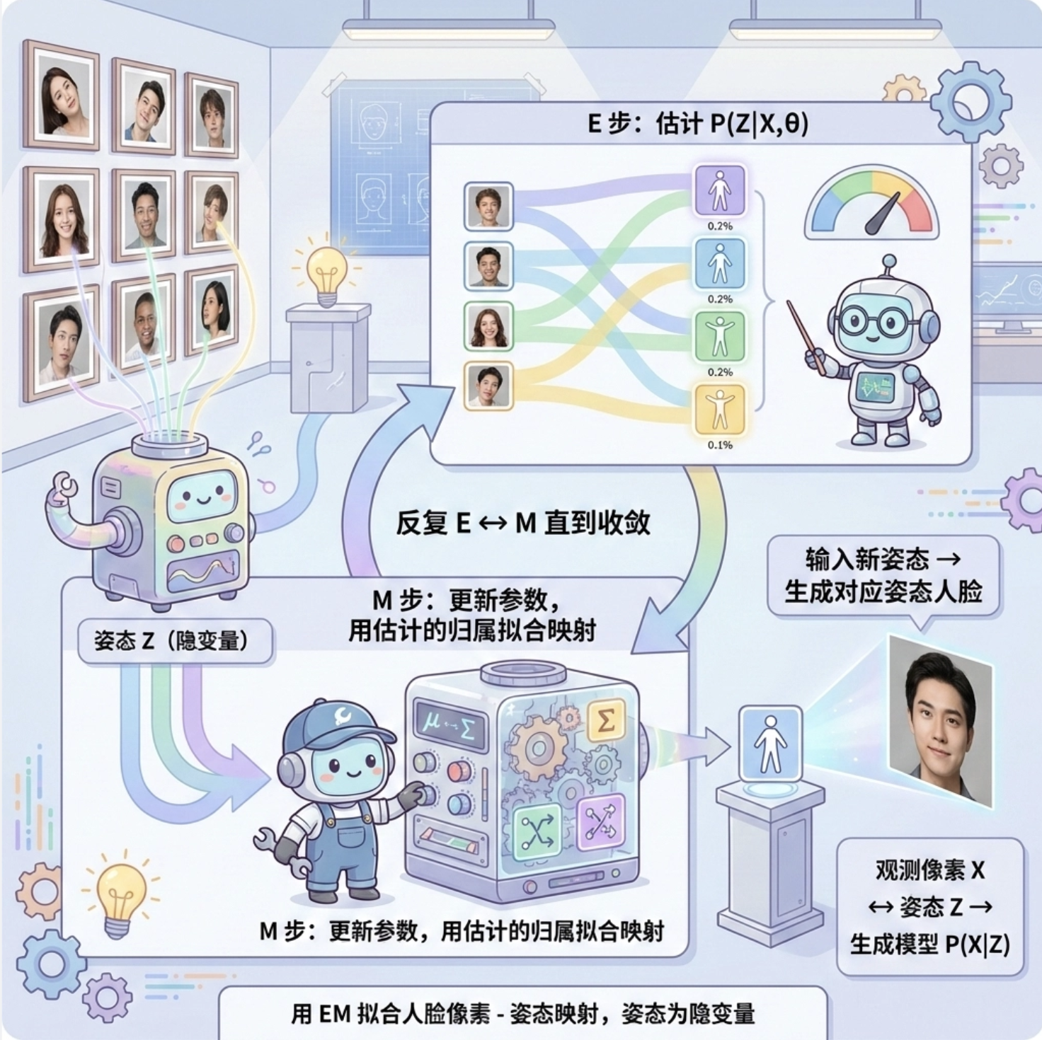 把 "姿态" 作为隐变量,用 EM 算法拟合 "人脸像素 - 姿态" 的映射关系,输入新姿态,生成对应姿态的人脸。