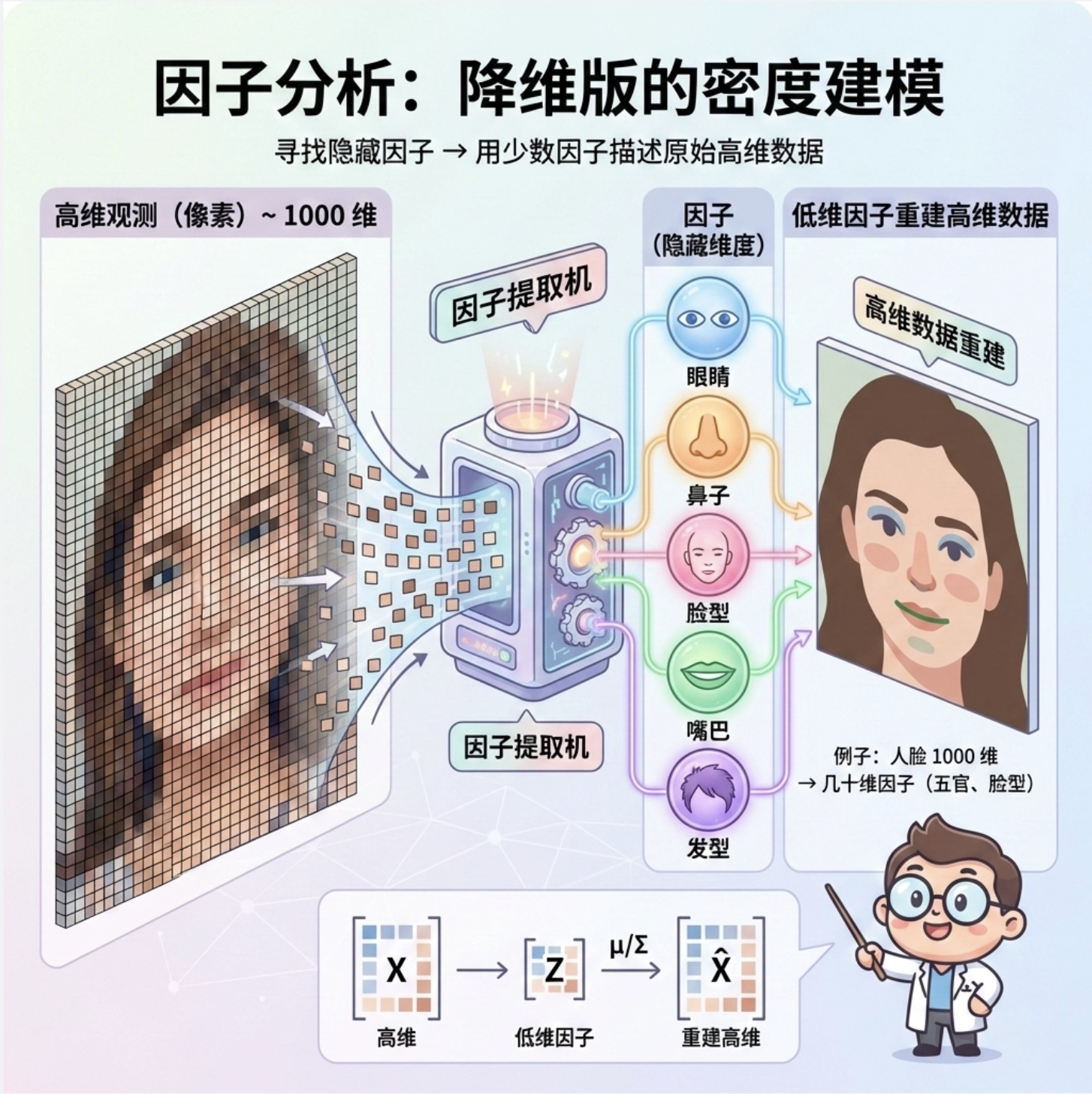 因子分析是 "降维版" 的密度建模 ------ 比如人脸数据有 1000 个像素(1000 维),但核心特征(比如五官位置、脸型)只有几十维,因子分析能找到这些 "隐藏因子",用低维因子描述高维数据。