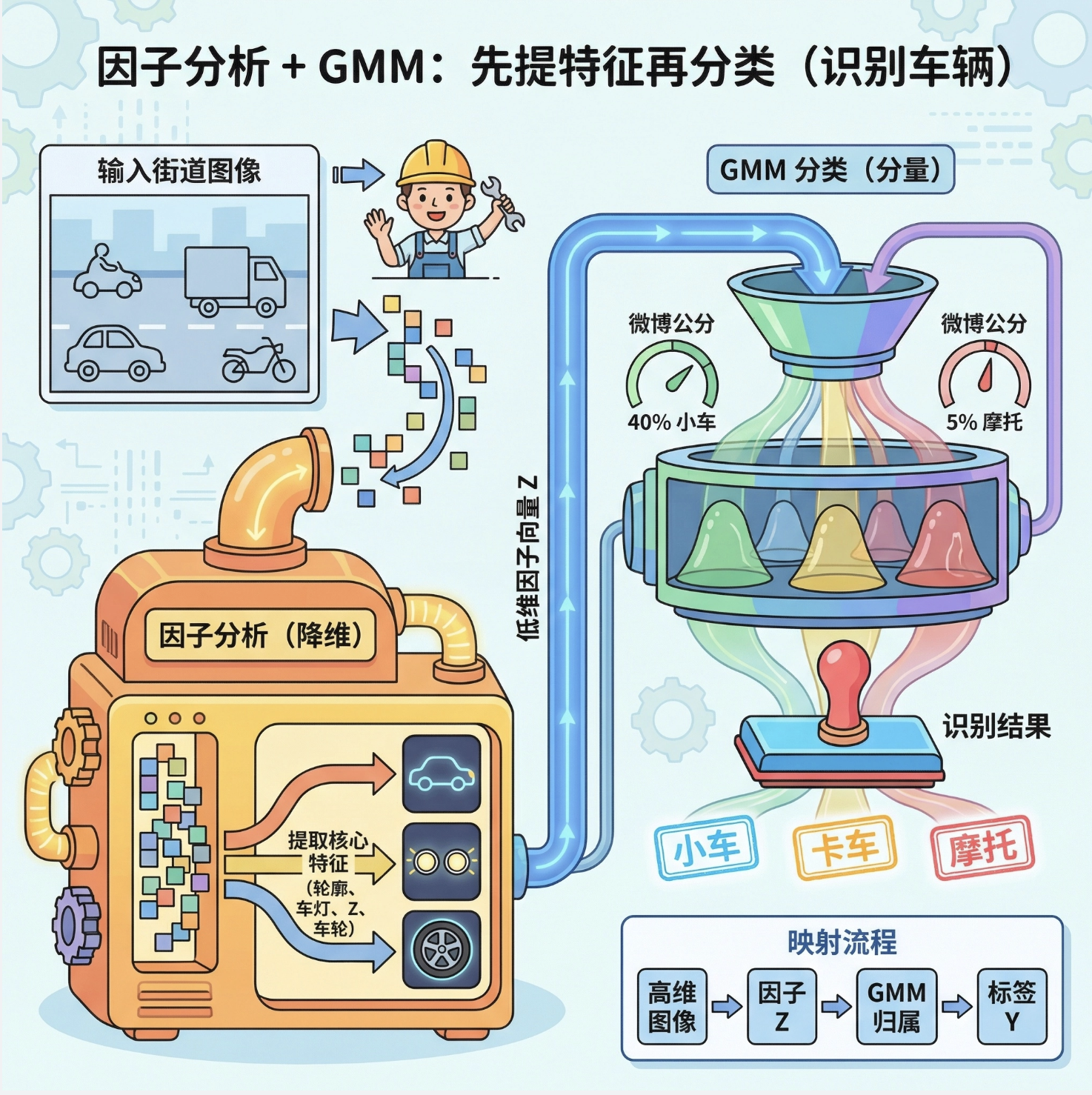 用因子分析提取目标的核心特征(比如汽车的轮廓、车灯位置),再用 GMM 分类,识别不同目标。