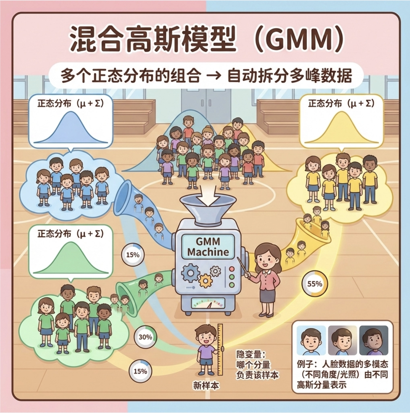 2.M 步(最大化步) :固定隐变量的概率,更新模型参数(比如 "用猜的归属重新算每个高斯的均值 / 协方差")