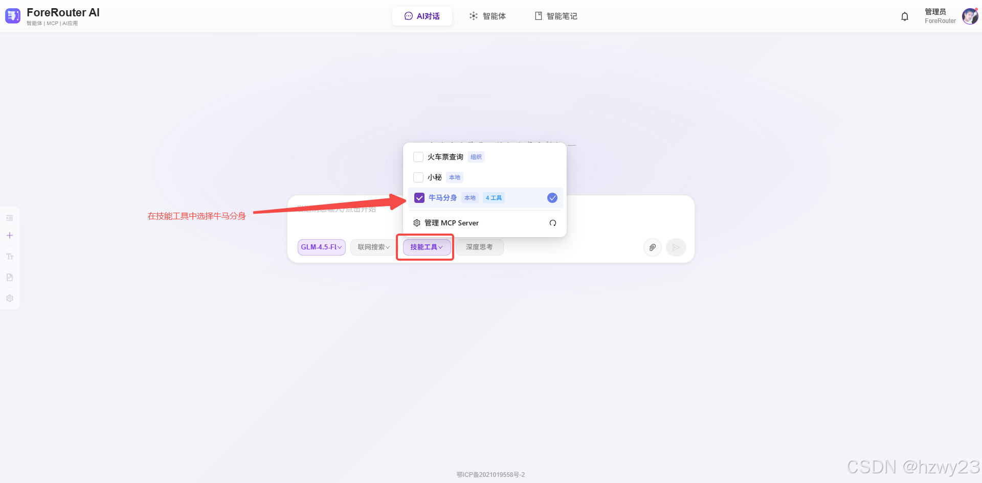 3.2.8 回到 AI对话 页面,并在技能工具中选择刚才配置的个人助理智能体