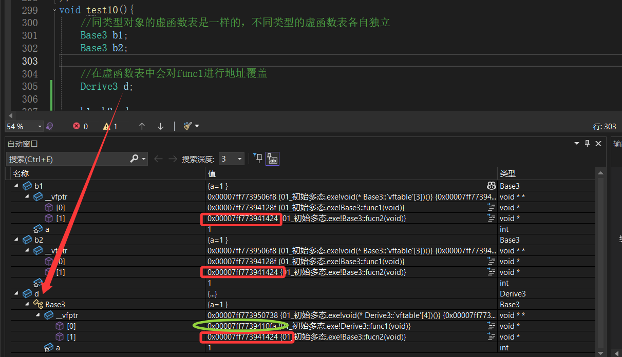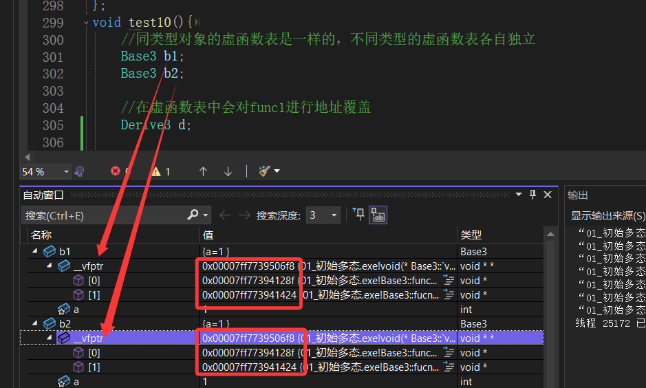 //同类型对象的虚函数表是一样的,不同类型的虚函数表各自独立