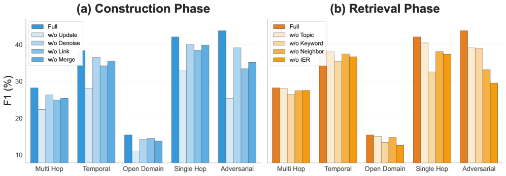 图2:消融实验。(a) 构建阶段各组件的贡献,(b) 检索阶段各组件的贡献。在 Qwen3-8B 上基于 LoCoMo 评估。
