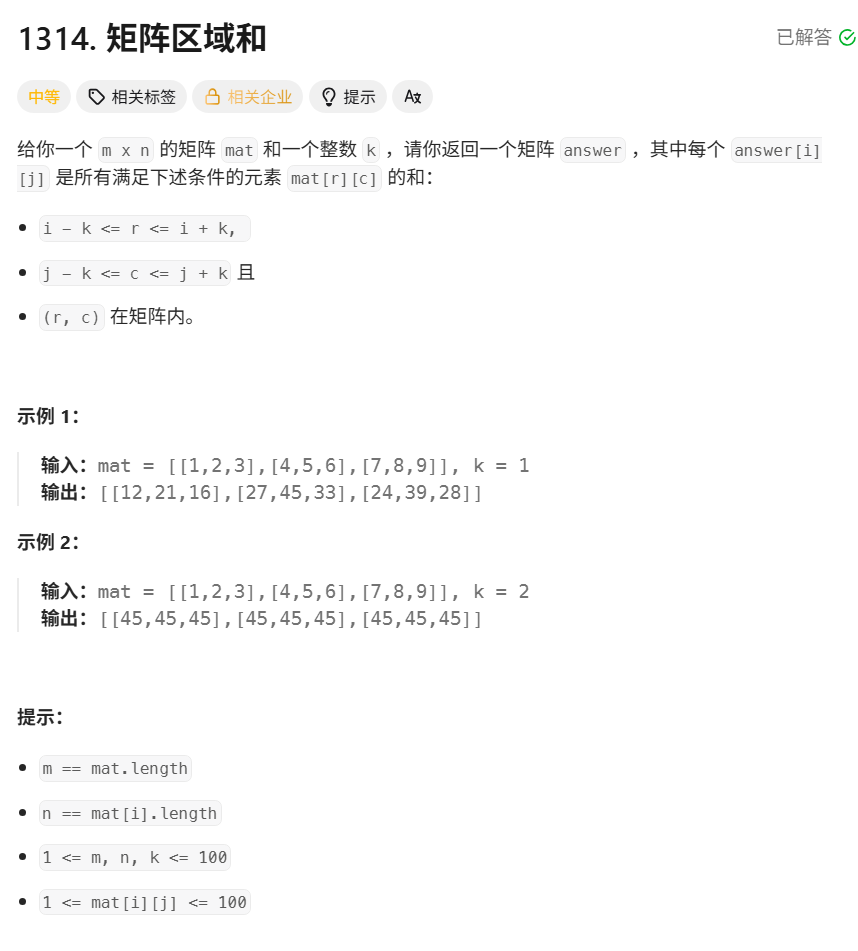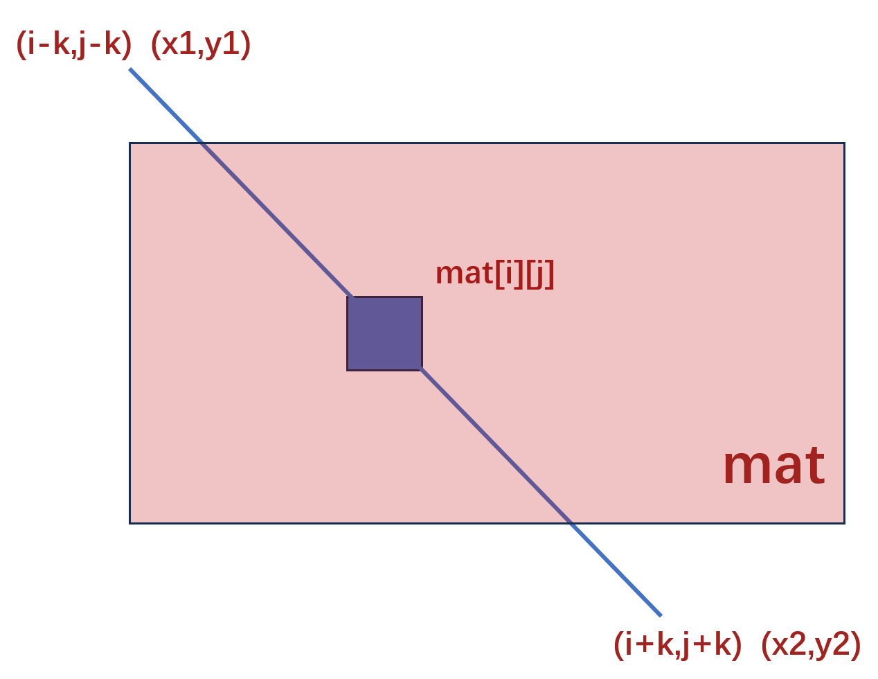 但经过k的扩展之后有可能越出m×n矩阵,题目要求的是(x1,y1)和(x2,y2)之间元素的和,且这些元素都要在mat内。