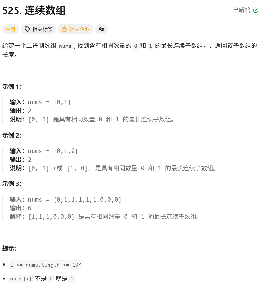 可以把所有0改成-1,在数组中找出最长的子数组,使子数组中所有元素的和为0