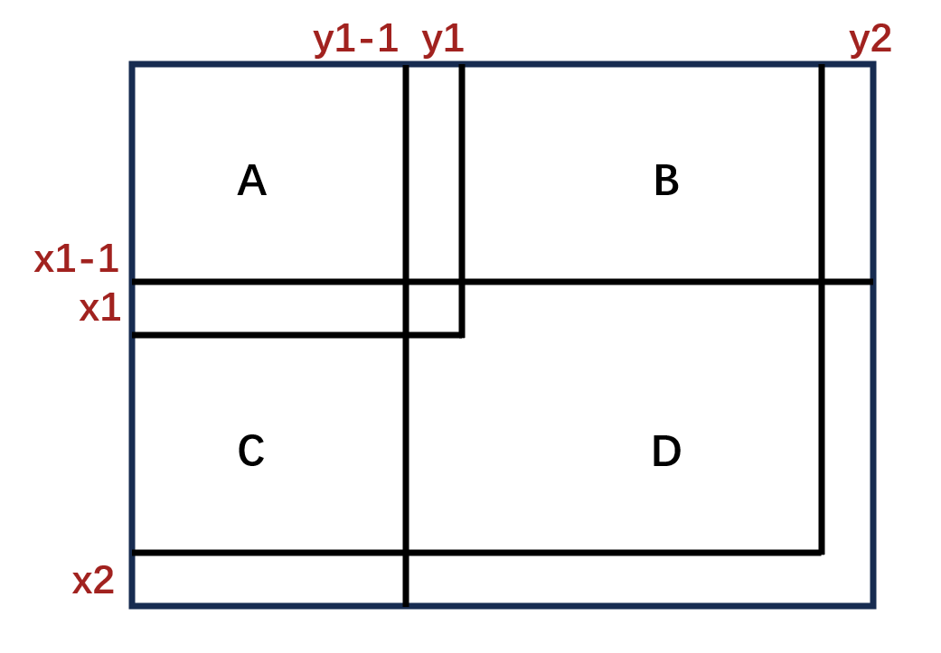 D=A+B+C+D-(A+B)-(A+C)+A=dp[x2][y2]-dp[x1-1][y2]-dp[x2][y1-1]+dp[x1-1][y1-1]