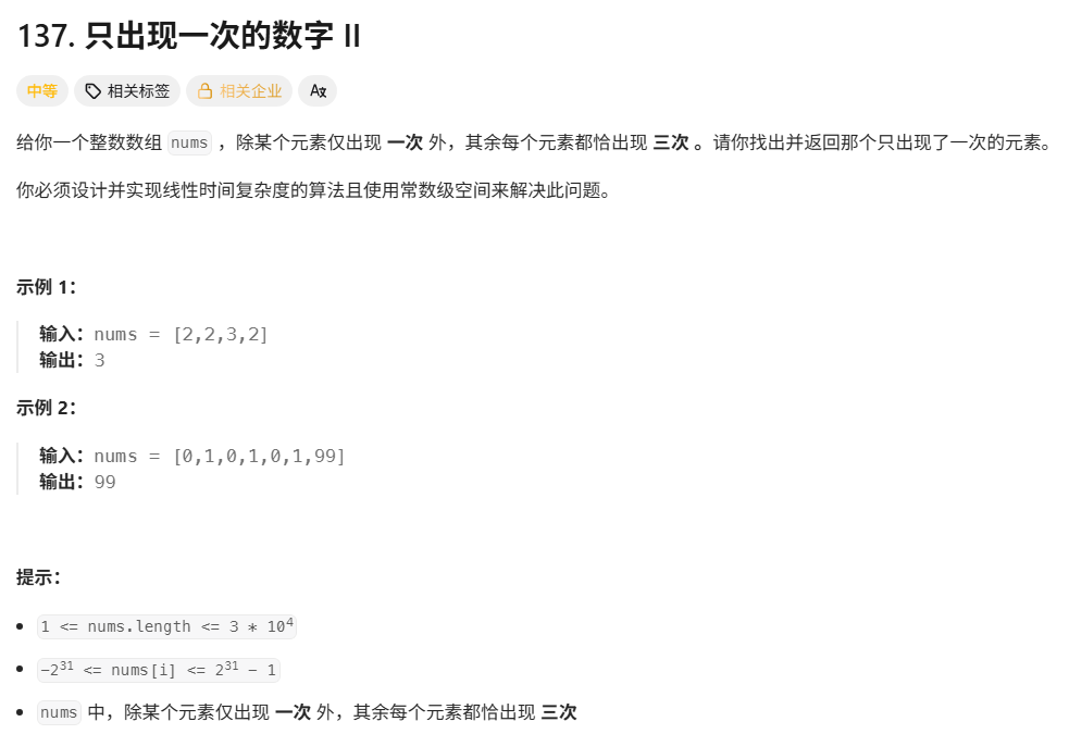 137. 只出现一次的数字 II - 力扣(LeetCode)