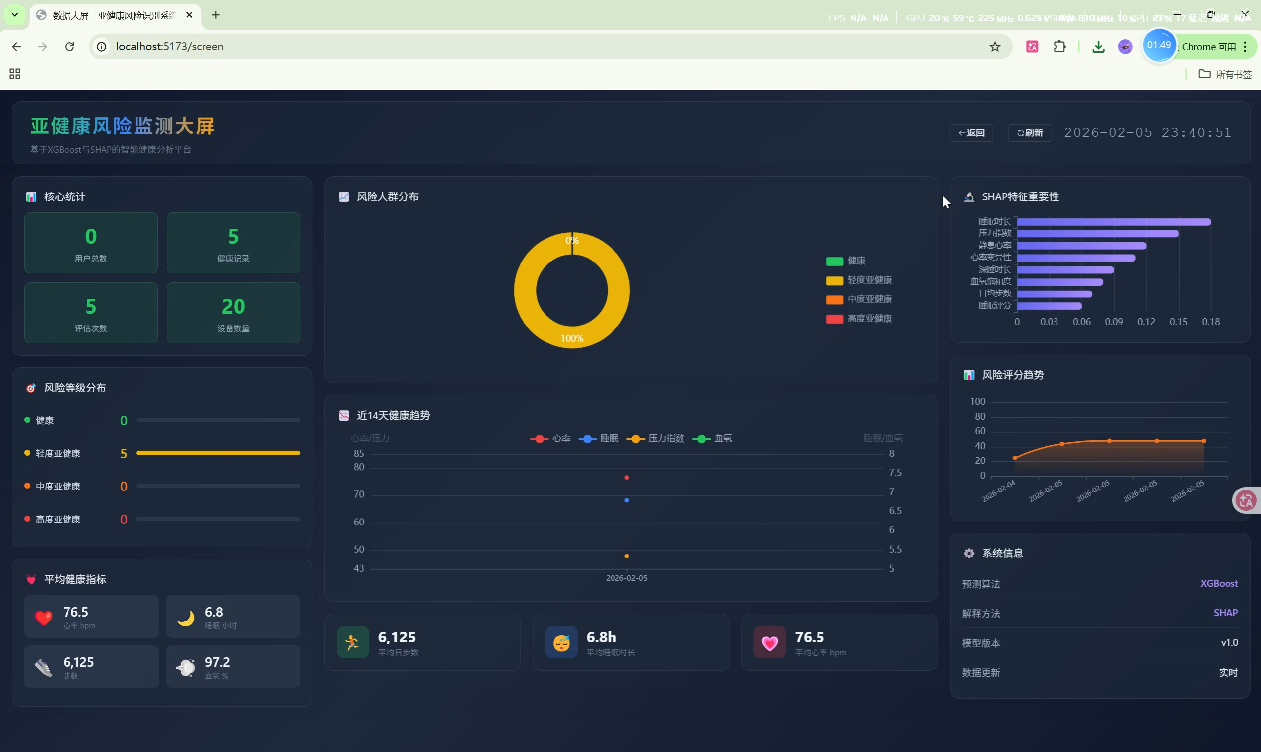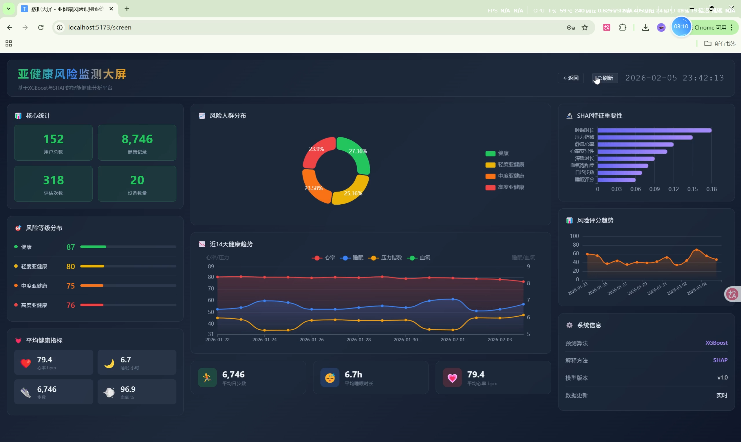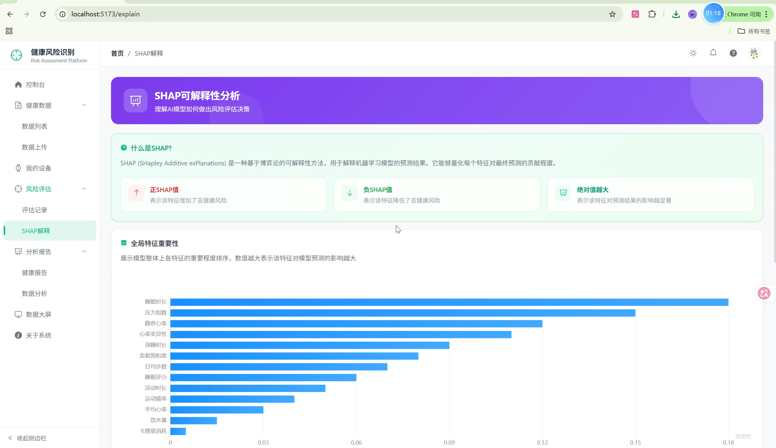 随着可穿戴设备的普及,人们可以方便地采集心率、睡眠、运动等健康数据。本系统利用机器学习技术,对这些数据进行分析,识别用户的亚健康风险,并通过SHAP可解释性技术让用户理解影响健康的关键因素。