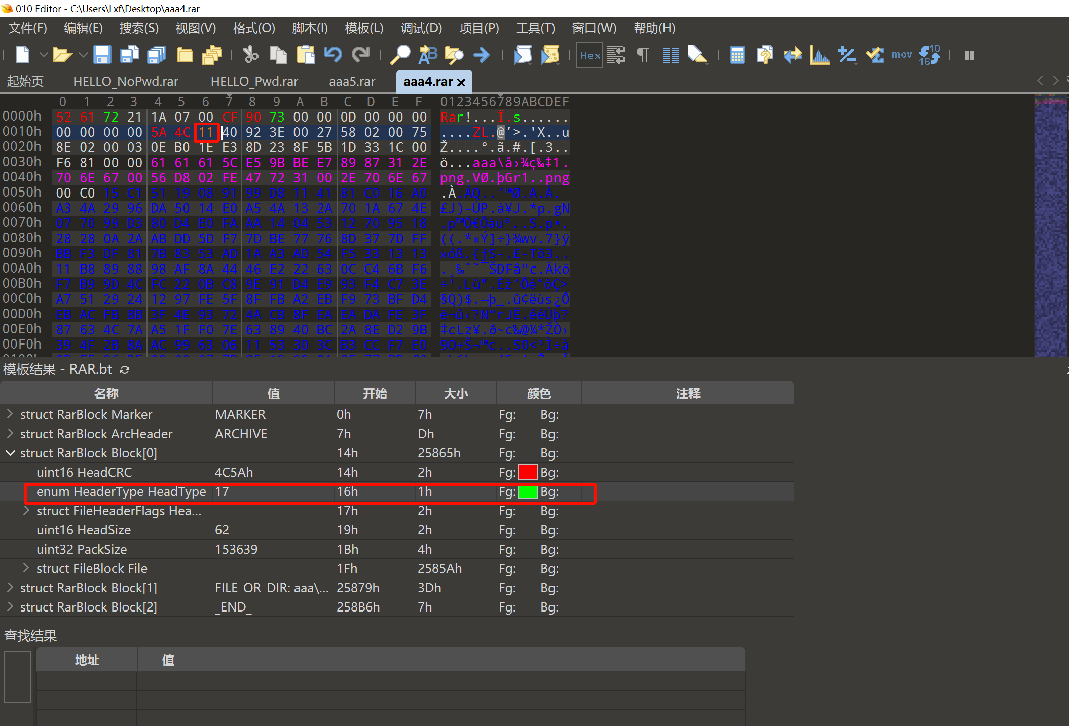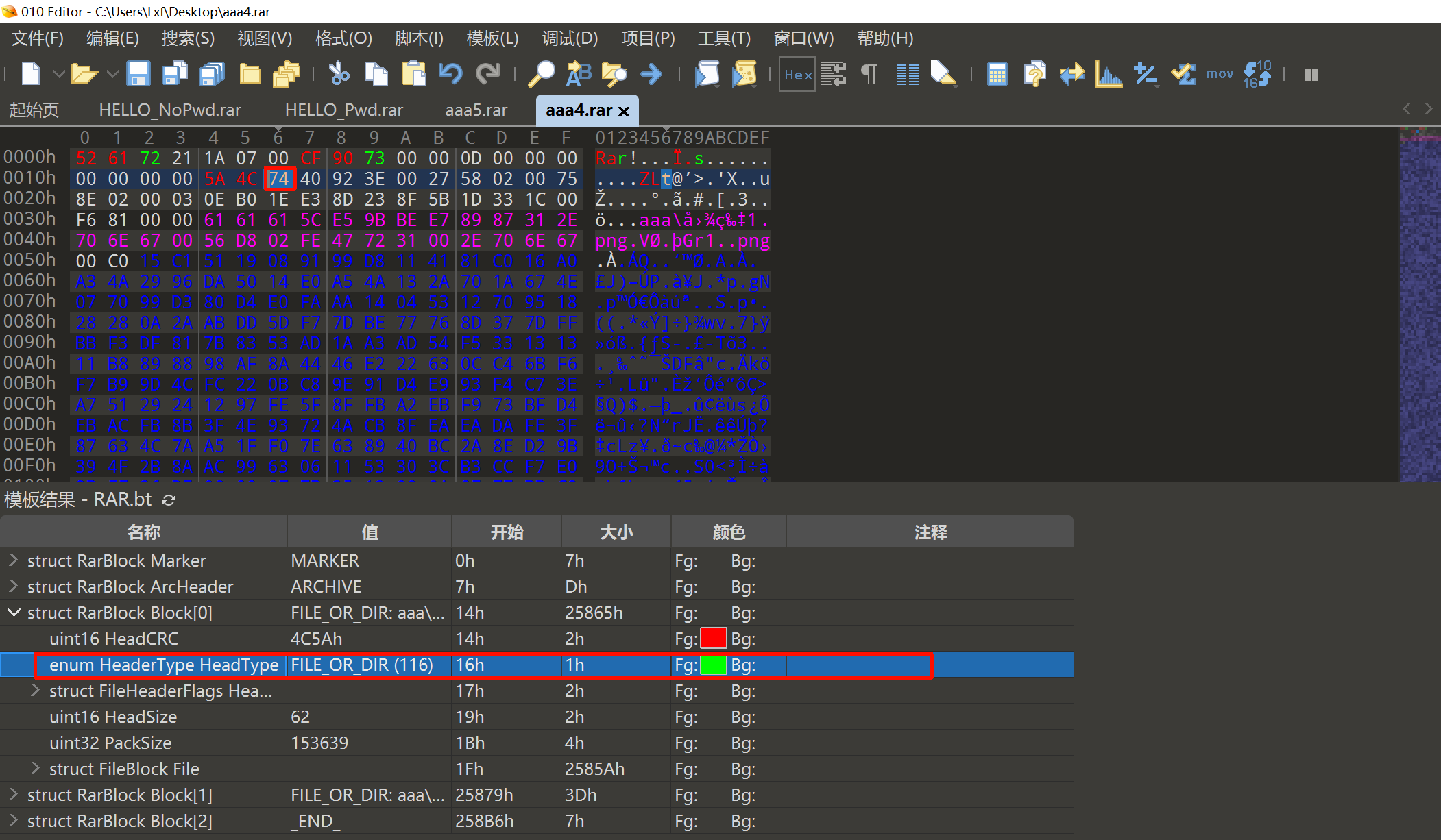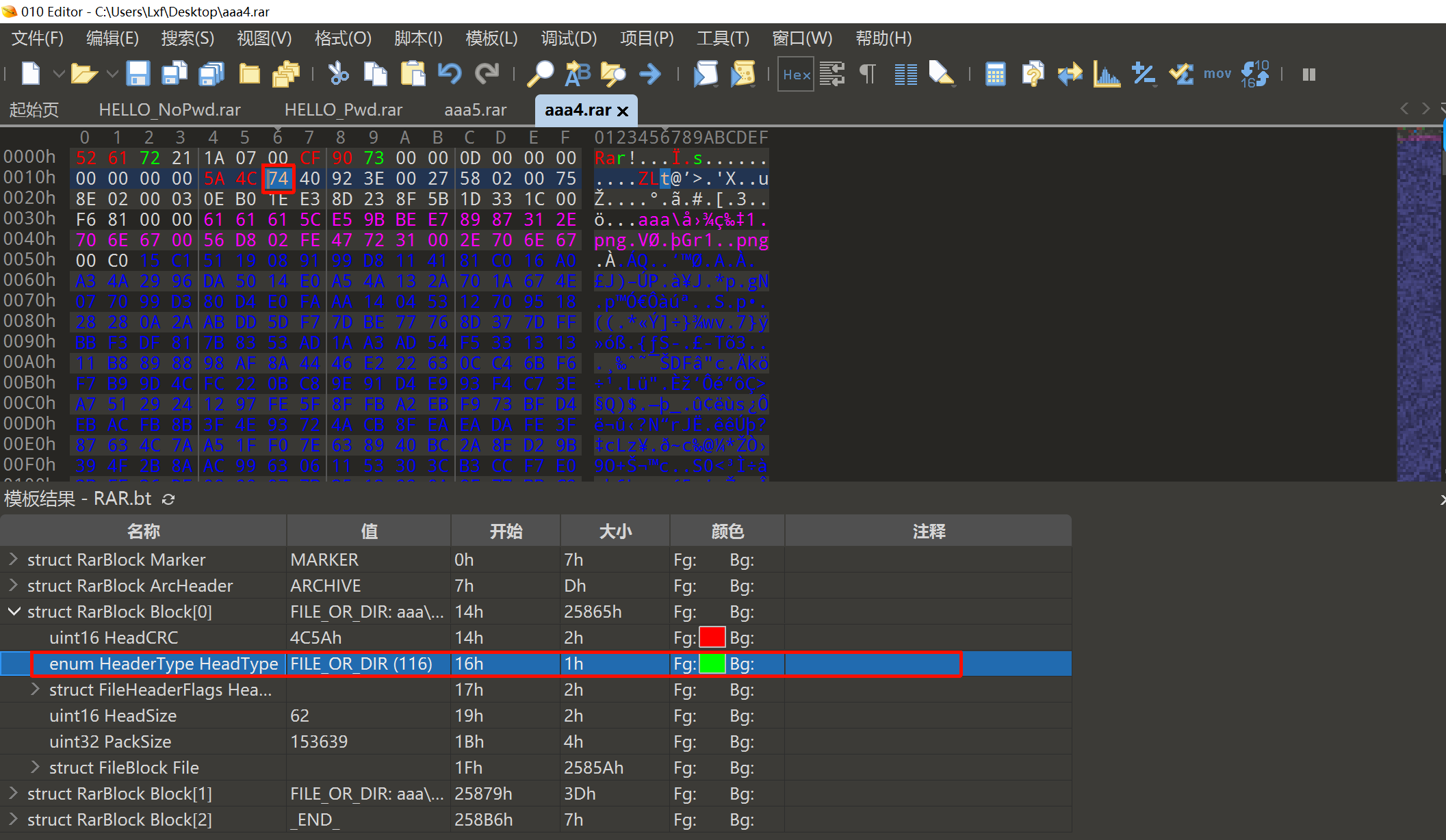 step2。使用010Editor打开aaa4.rar,找到Block[0](对应的数据文件为图片1.png)中的HeadType字段,发现该字段值为74。