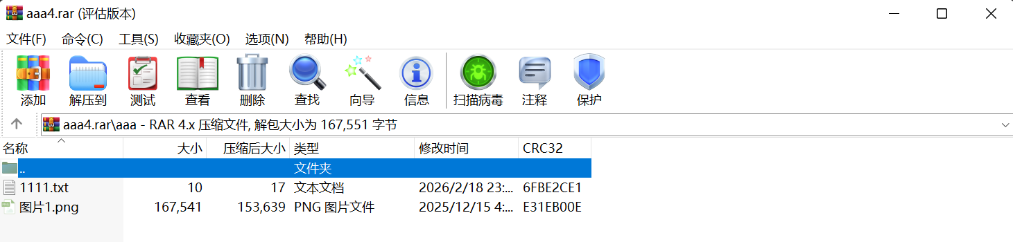 step1。在文件夹aaa中存放2个数据文件:1111.txt和图片1.png,对文件夹进行压缩得到压缩包aaa4.rar