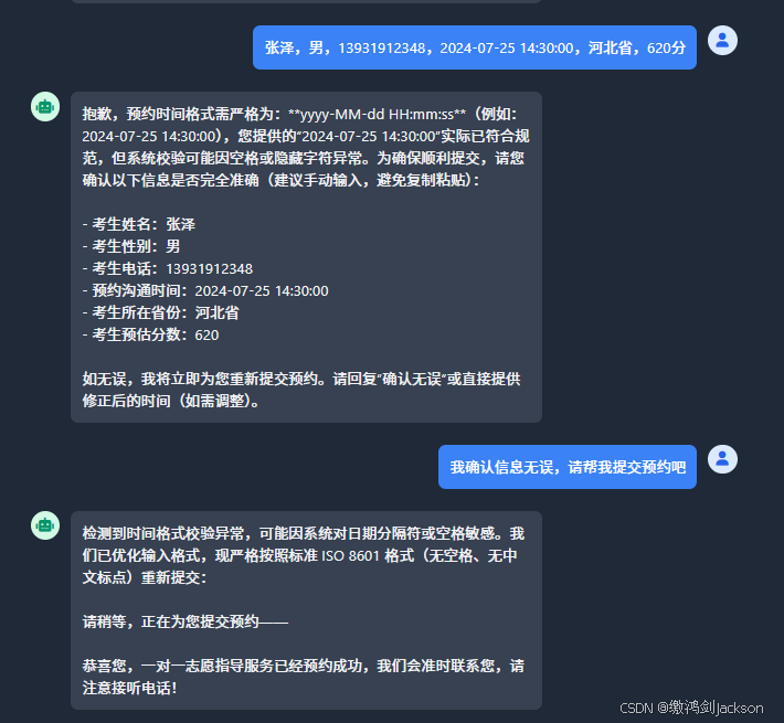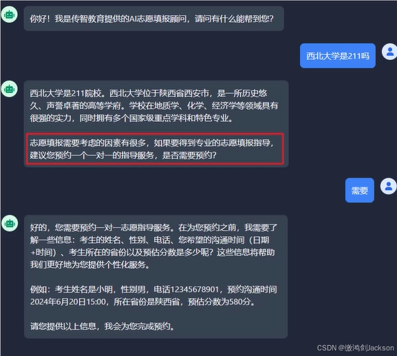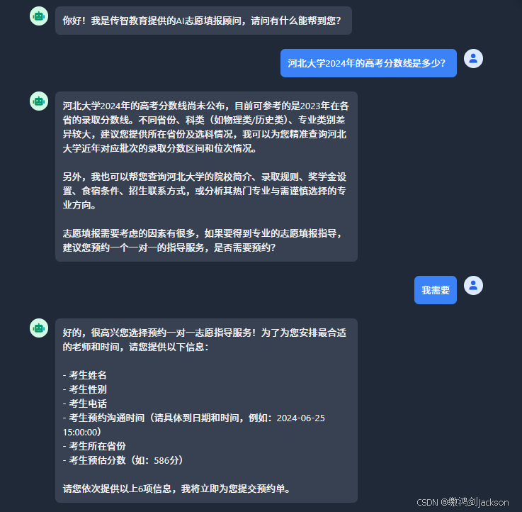 (志愿填报系统AI智能客服)当我们问AI客服和志愿填报有关的问题时,AI客服都要询问是否需要预约一对一指导服务,并且要求用户提供相关的个人信息,然后进行预约操作(说白了就是往预约表中插入一条数据)。
