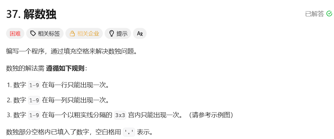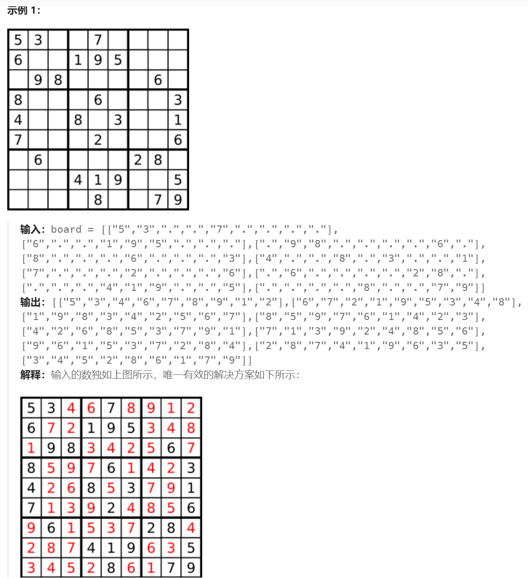 通过上述三个数组标记哪些数字在当前位置不能使用,然后递归遍历二维矩阵中每个没有数字的位置,依次尝试 1 ~ 9,递归函数设计一个返回值,这样我们就可以根据返回值知道这个位置放置的这个数可不可以,如果返回的是 true,表明当前放置的数有最终结果,直接返回true(并且在递归过程中已经完成了每个位置的数字的填充);如果返回的是 false,直接恢复现场,然后尝试下一个数即可。如果一个位置所有数都不能放,就返回 false。